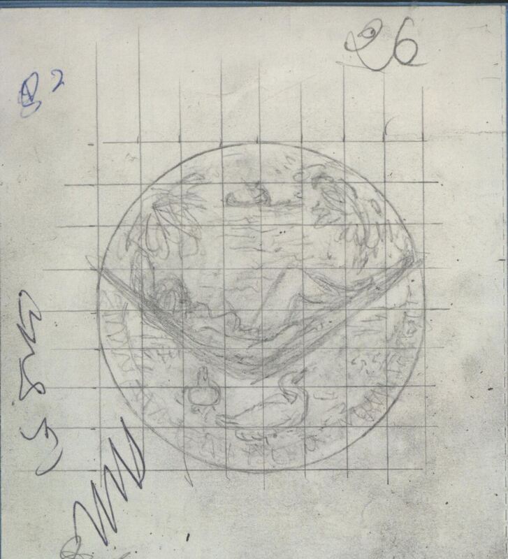 Boceto a lápiz sobre fondo cuadriculado de la medalla número veintiséis donde se representa en primer término a una mujer desnuda tumbada en una hamaca junto a unos patos y al fondo la silueta de un hombre remando en una canoa.Para Numismatica Iberica Oyros archivos: Mbo/485 MEN/1777 MBR/1365