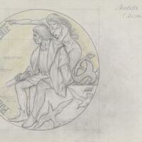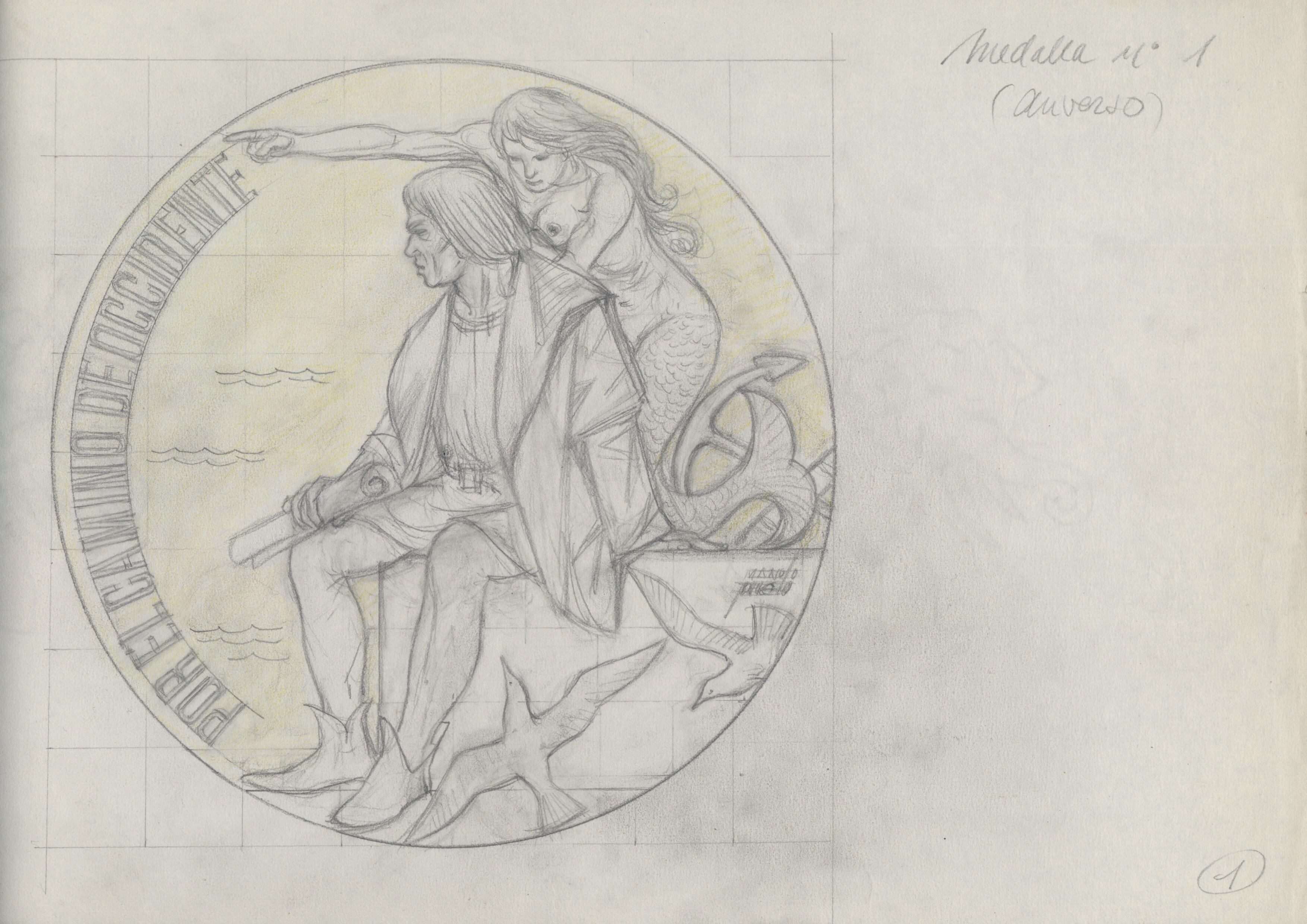 Boceto del anverso de la medalla número 1, a lápiz, sobre un fondo de color claro, donde se representa la figura de Cristóbal Colón sentado con un pergamino en la mano mirando al horizonte y detrás de él la figura de una sirena que extendiendo su brazo señala la dirección a donde debe dirigirse.V Centenario … medalla nº1 anverso para Numismatica Iberica.OTROS ARCHIVOS.: Mbo/.429. Mbo/383+386+394) Men/1782+1783) MBr/1335