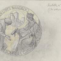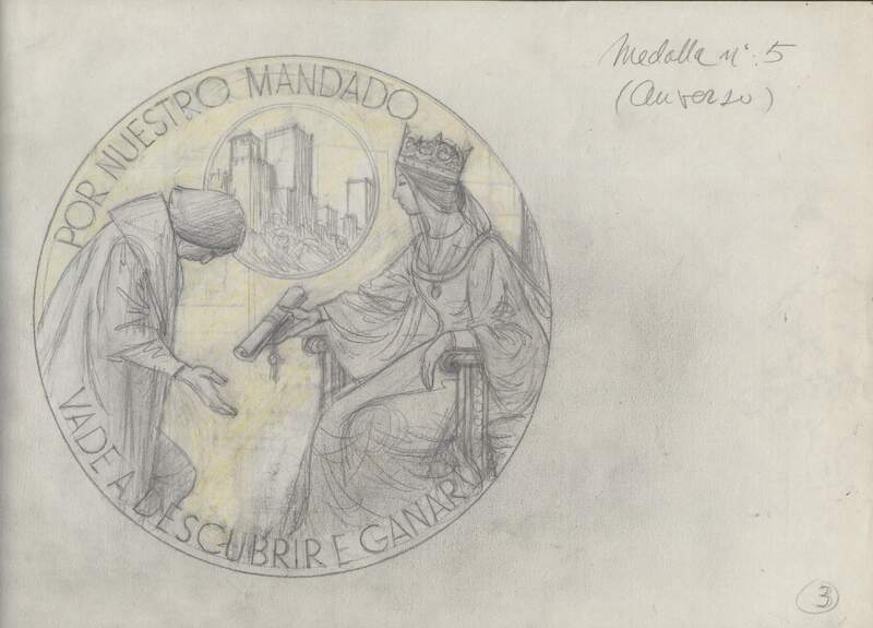 Boceto a lápiz sobre fondo claro del anverso de la medalla número cinco donde se representa a Cristóbal Colón con gesto de reverencia ante la Reina Isabel La Católica sentada y extendiendo en su mano la orden para emprender el viaje, alrededor de la escena ocupando el perfil de la medalla se lee “por nuestro mandado vade a descubrir e ganar.”Serie realizada para Numismatica Iberica. Anverso Otros Archivos: MBR/1342 anv. Revrs. MEN/1767 + 1768
