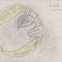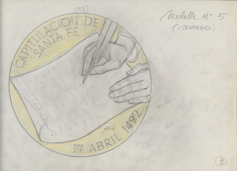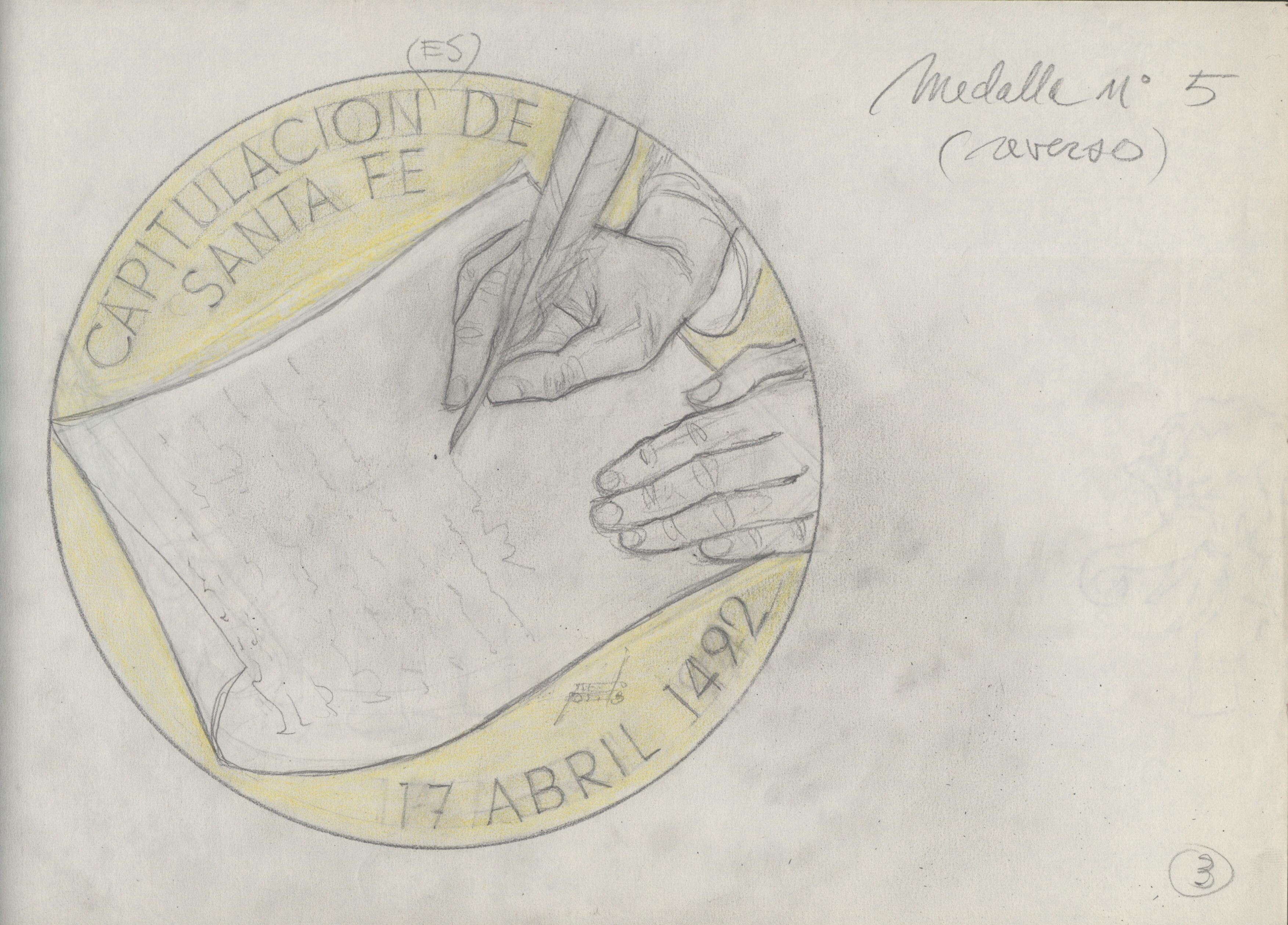 Boceto a lápiz sobre fondo claro del reverso de la medalla número cinco donde se representa las manos de un escribano que con una pluma redacta un documento alrededor de la escena ocupando el perfil de la medalla se lee “capitulación de Santa Fe 17 de Abril 1492”.Serie para Numismática Iberica (revrs.) OTROS ARCHIVOS: MD/439 MBR/1342 MEP/1767+1768