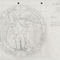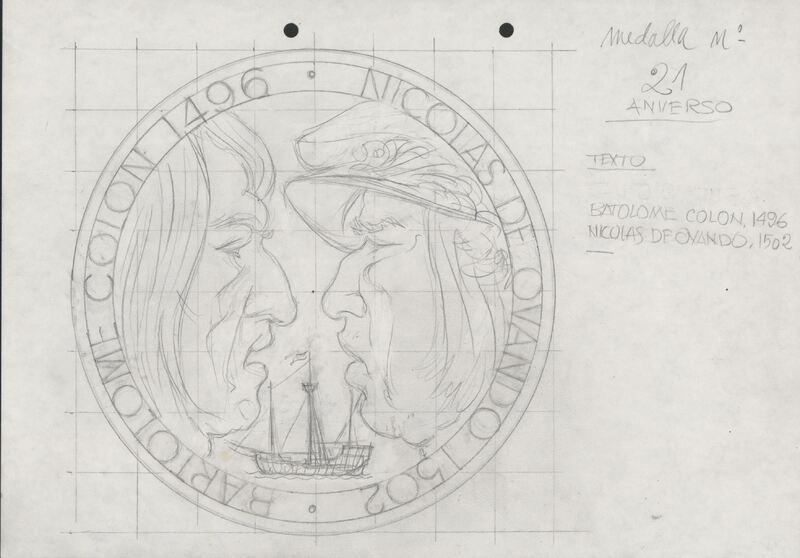 Boceto a lápiz sobre fondo cuadriculado del anverso de la medalla número veintiuno, con los dos retratos enfrentados de Bartolomé Colón y Nicolás de Ovando, junto anotaciones a lápiz del autor.para Numismática Iberica OTROS ARCHIVOS: MBR/1361 MBO/416+474