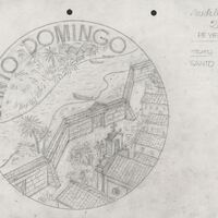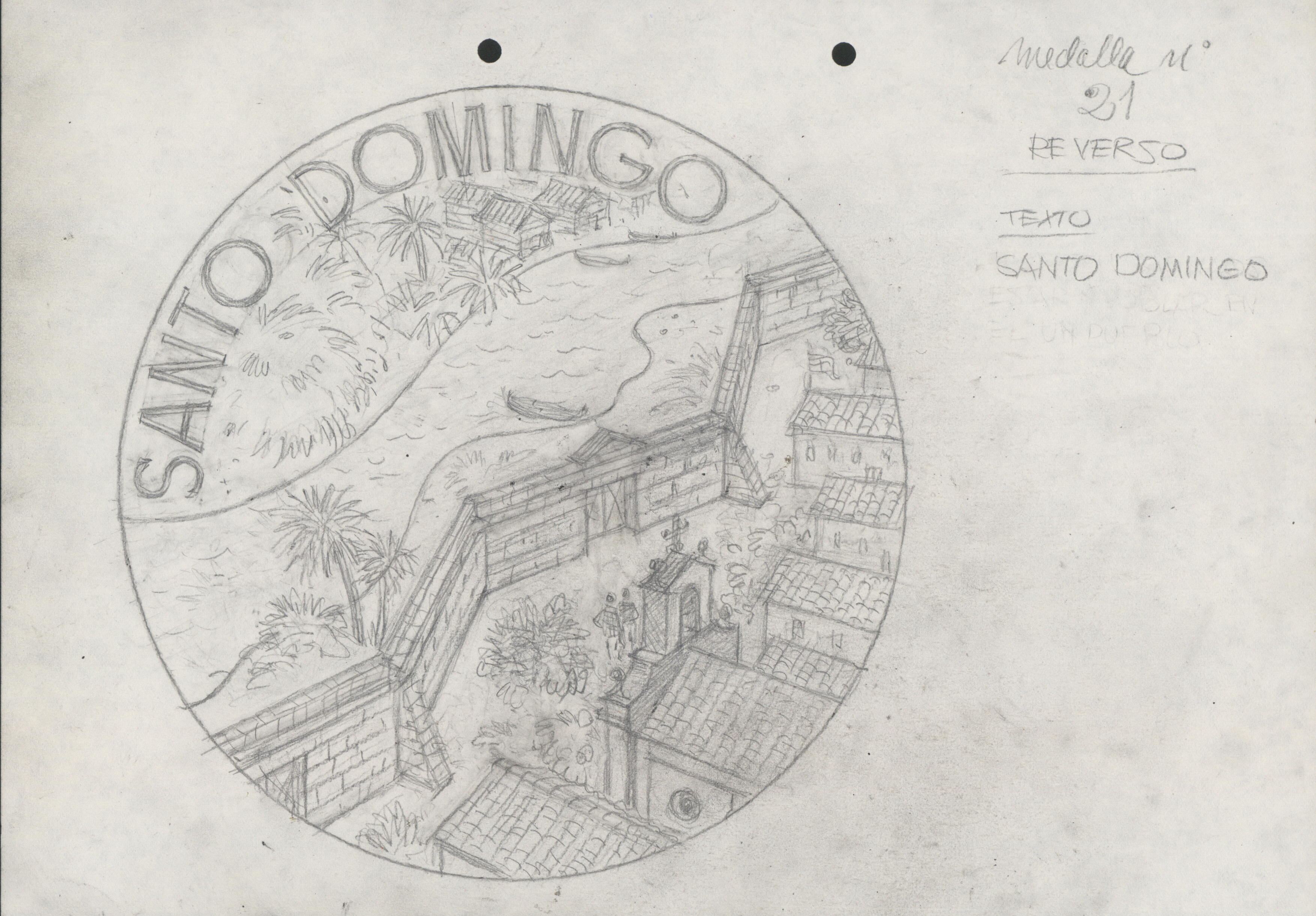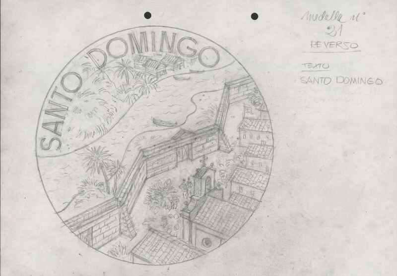 Precioso boceto a lápiz sobre del reverso de la medalla número veintiuno, con la perspectiva de la ciudad amurallada de Santo Domingo junto al mar. Al lado anotaciones a lápiz del autor.para Numismática Iberica OTROS ARCHIVOS: MBR/1361 MBO/416+473