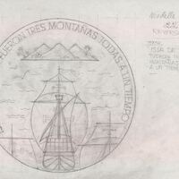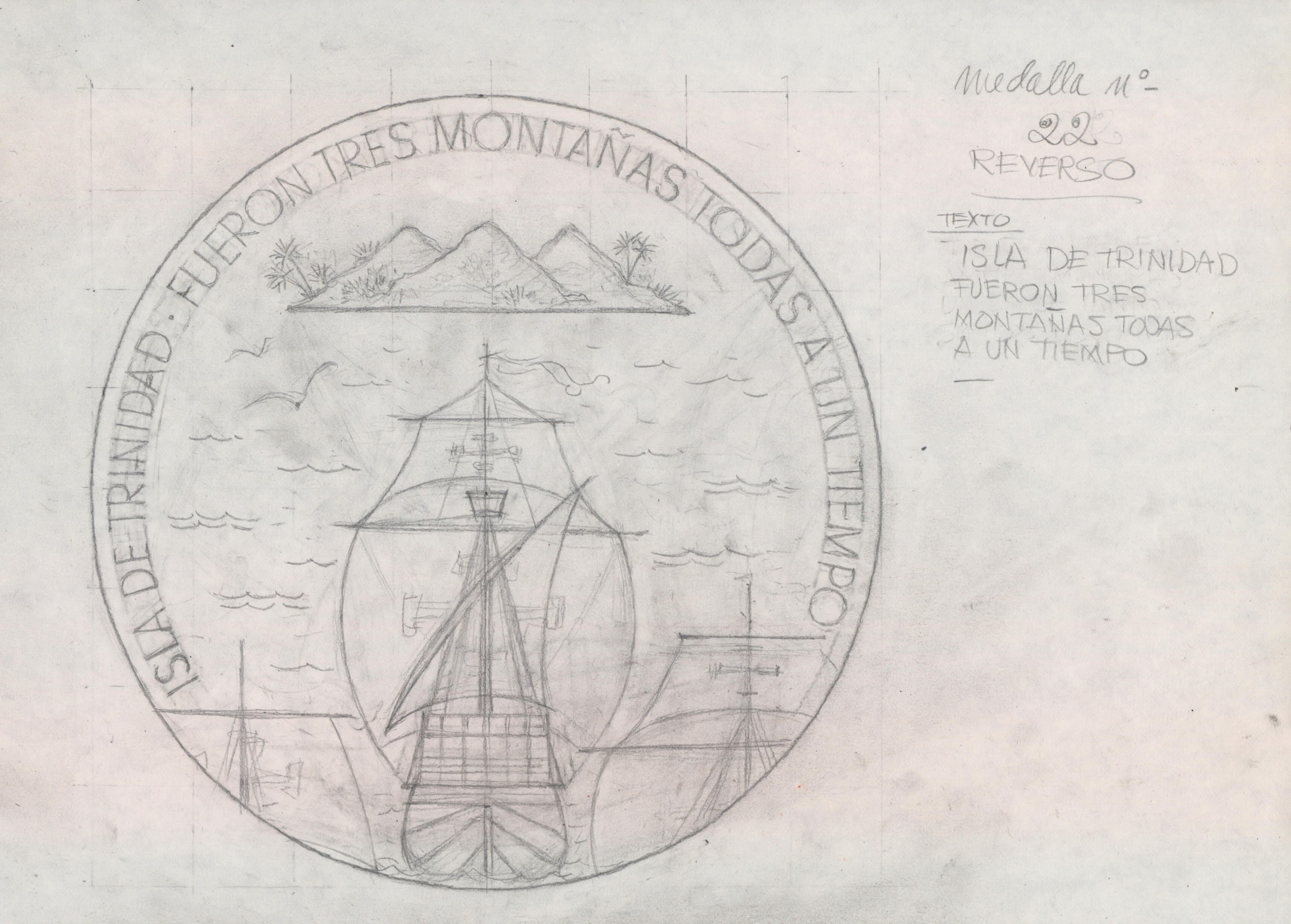Boceto a lápiz del reverso de la medalla número veintidós, con la imagen en primer término de la proa de un barco que se acerca hacia una isla formada por tres montañas, junto a la leyenda inscrita en el perfil de la medalla que dice “Isla de Trinidad, tres montañas todas a un tiempo.”para Numismática Iberica OTROS ARCHIVOS: MBR/1364 MBO/416+475