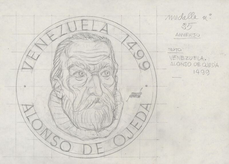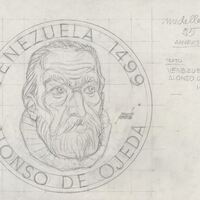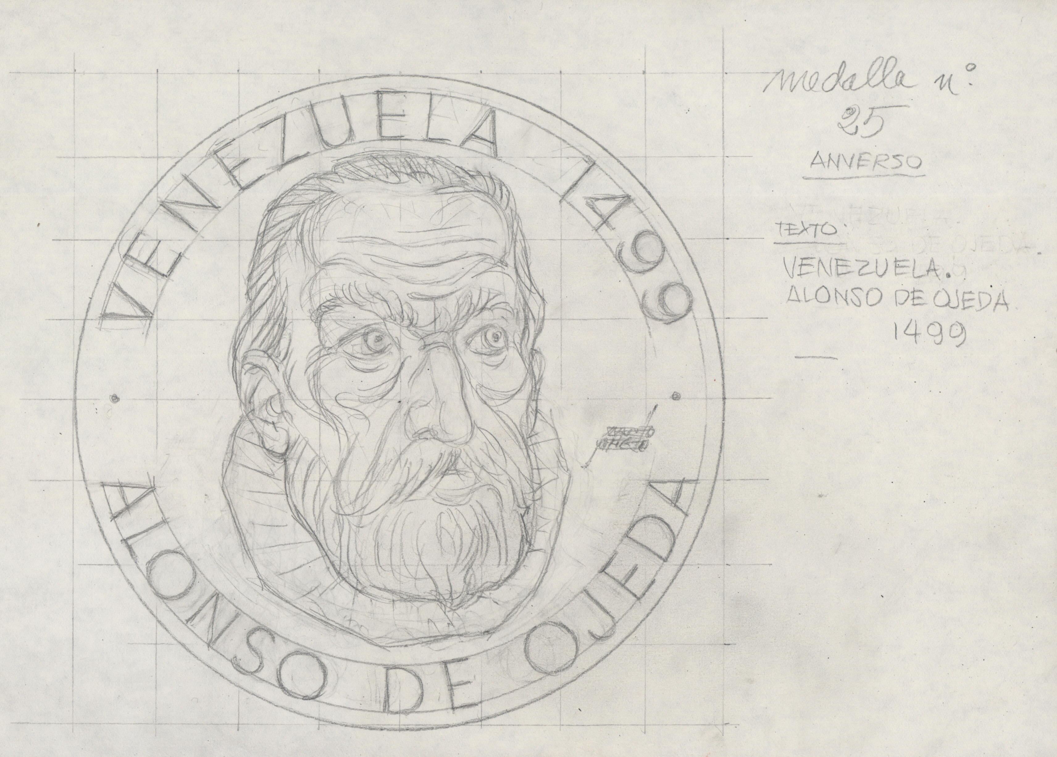 Boceto a lápiz del anverso de la medalla número veinticinco, con un magnífico retrato de Alonso Ojeda cuyo nombre y Venezuela 1499 aparece rodeando el perfil de la medalla.para Numismática Iberica serie del V Centenario. OTROS ARCHIVOS. MBR/1339 (anv-rev.) MBO/390+424+483
