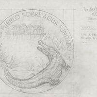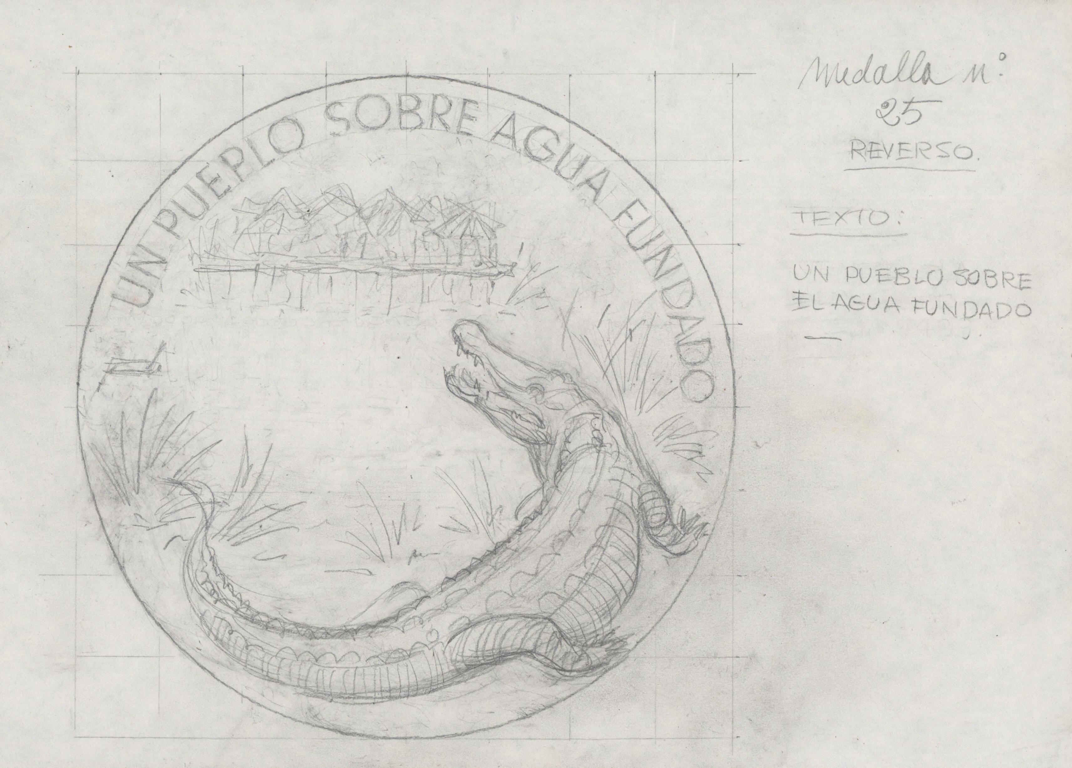 Boceto a lápiz del reverso de la medalla número veinticinco, donde en primer término aparece un cocodrilo que mira la silueta de un poblado sobre unas estructuras de madera que le aíslan y separan del agua, junto a la leyenda inscrita en el perfil de la medalla que dice “un pueblo fundado sobre el agua”.Para Numismática Iberica. OTROS ARCHIVOS: MBR/ 1339 MBO/390+424+482