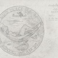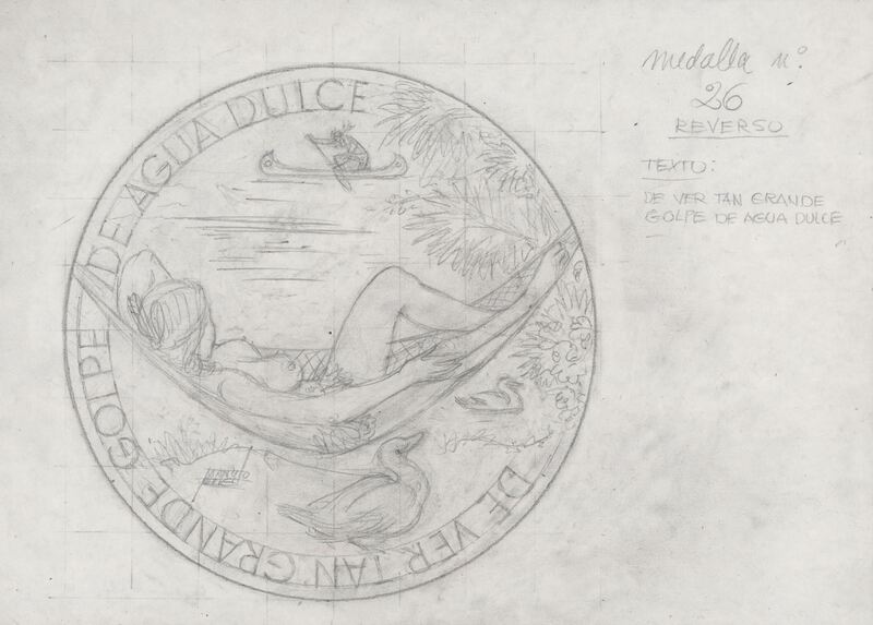 Boceto a lápiz del reverso de la medalla número veintiséis, donde en primer término aparece la figura de una mujer desnuda sobre una hamaca y al fondo la silueta de un hombre remando en una canoa, junto a la leyenda inscrita en el borde de la medalla “de ver tan grande golpe de agua dulce.”Para Numismatica Iberica. OTROS ARCHIVOS: MBR/1365(anverso-reverso) MBO/484