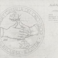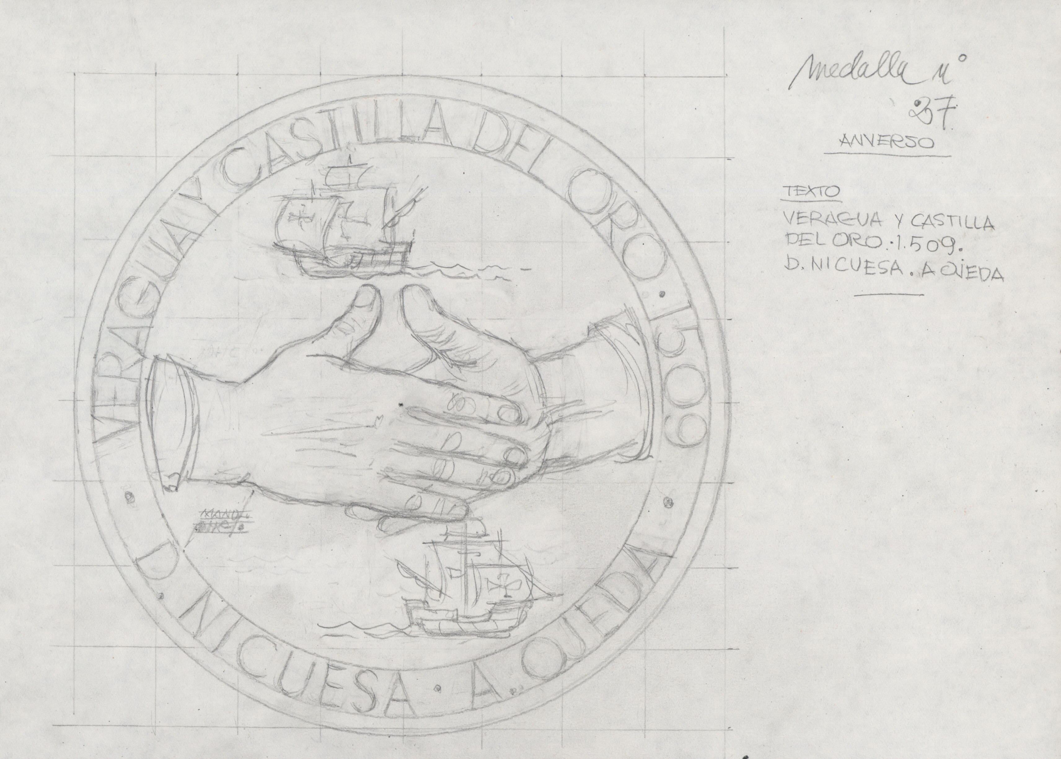 Boceto a lápiz del anverso de la medalla número veintisiete, donde aparece la figuras de dos manos saludándose y en el espacio que queda entre ellas la silueta de dos barcos españoles, rodeado por la leyenda inscrita en el perfil de la medalla que dice “Veragua y Castilla del Oro 1509, D. Nicuesa, A. Ojeda.”Para Numismatica Iberica. OTROS ARCHIVOS: MBR/1341.(anverso y reverso) MBO/422+487 MEN/1787(reverso)