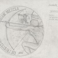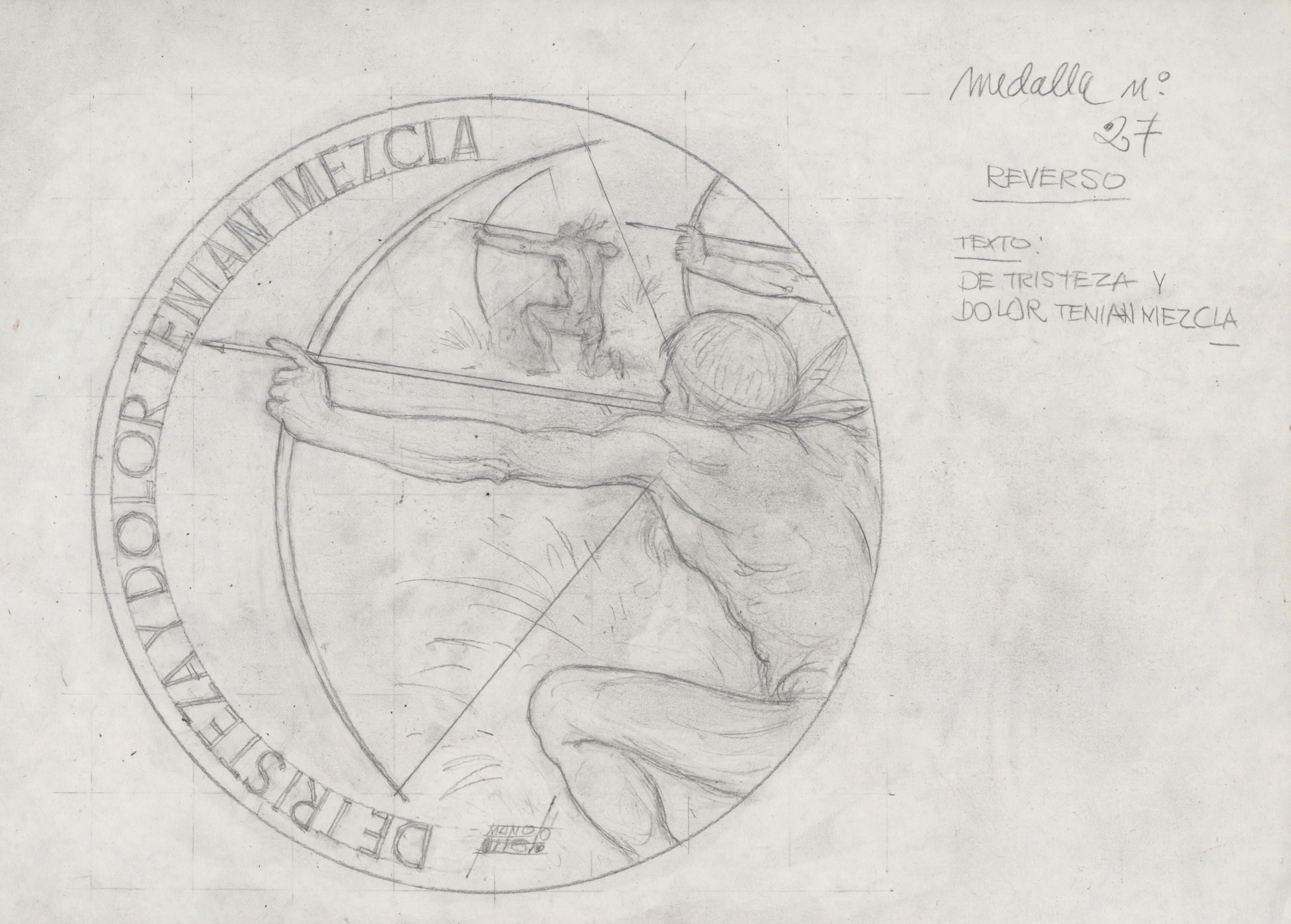 Boceto a lápiz del reverso de la medalla número veintisiete, donde aparece dos indígenas defendiéndose con arcos junto a la leyenda inscrita en el perfil de la medalla que dice “de tristeza y dolor tenían mezcla”.Para Numismática Iberica. OTROS ARCHIVOS: MBR/1341 MEN/Ficha. 1787 MBO/422 +486(anverso)