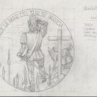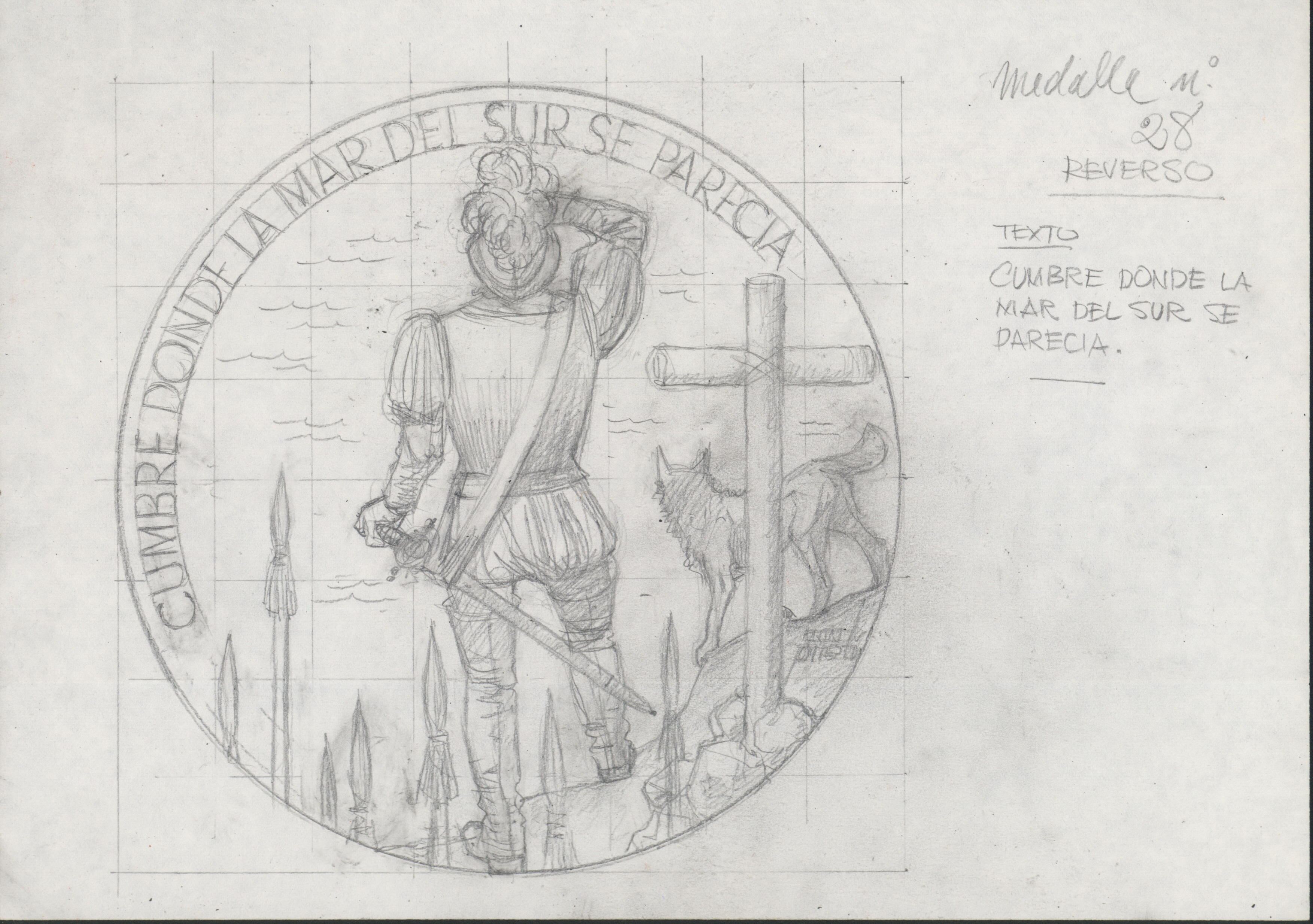 Boceto a lápiz del reverso de la medalla número veintiocho, con la figura de Vasco Núñez de Balboa de espaldas y en primer término junto a un perro y una cruz de madera y numerosas lanzas, que mira atentamente al horizonte rodeado por la leyenda inscrita en el borde de la medalla que dice “Cumbre donde la mar del sur se parecía.”Para Numismática Íberica. OTROS ARCHIVOS:MBR/1362 (anv. Y Rev.). MEN/1778 MBO/ 488
