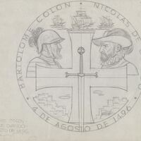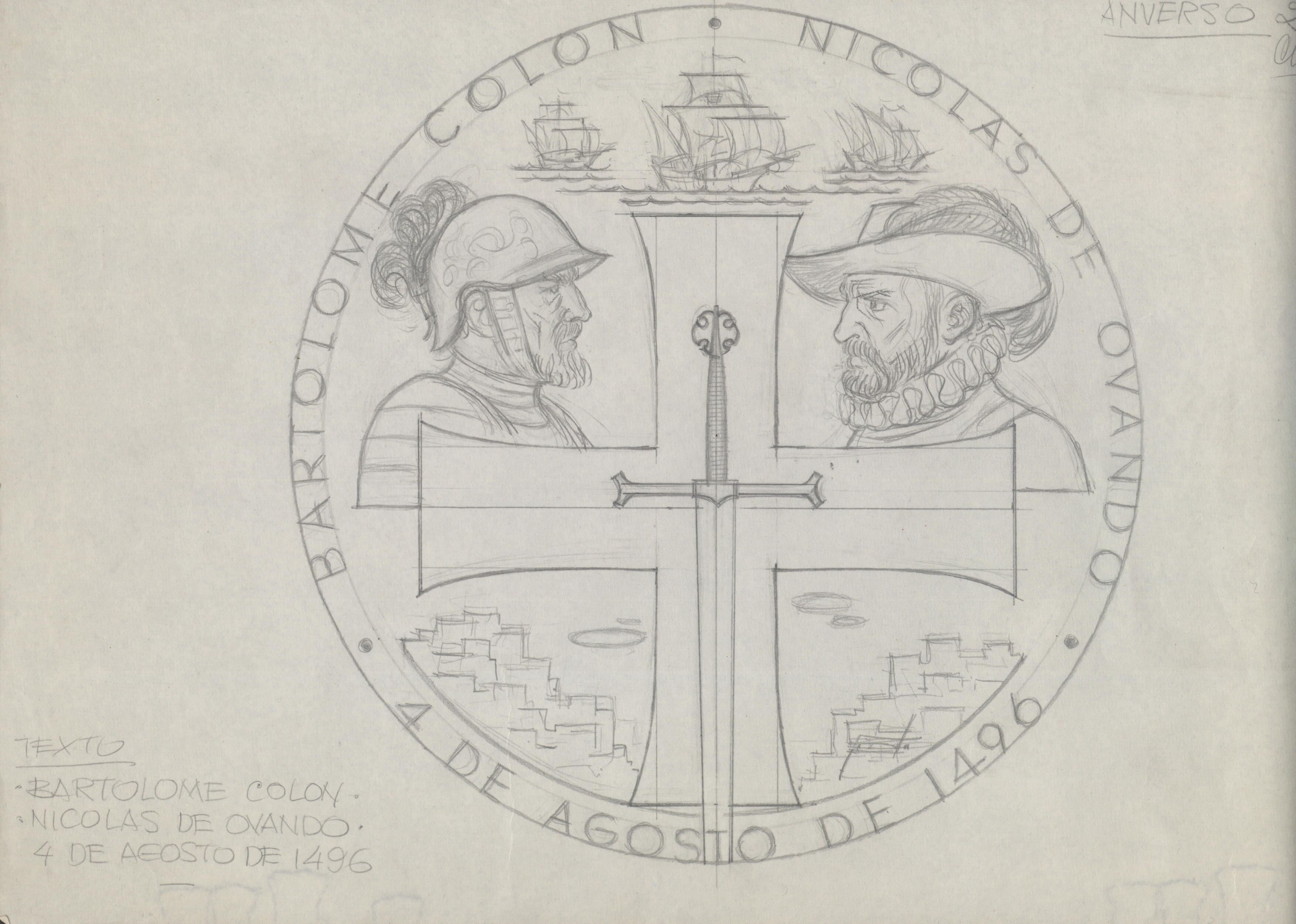 Boceto a lápiz de una de las caras de una medalla, donde se aprecia una gran cruz central con una espada dibujada en su centro, en cuyos espacios se aprecia los retratos enfrentados de Bartolomé Colón y Nicolás Ovando y los bocetos de un conjunto de casas y las siluetas de unos barcos.Sin referencias. Posible estudio para la serie del V centenario del descubrimiebnto de América.
