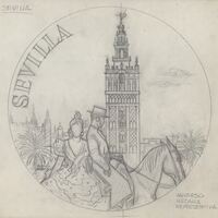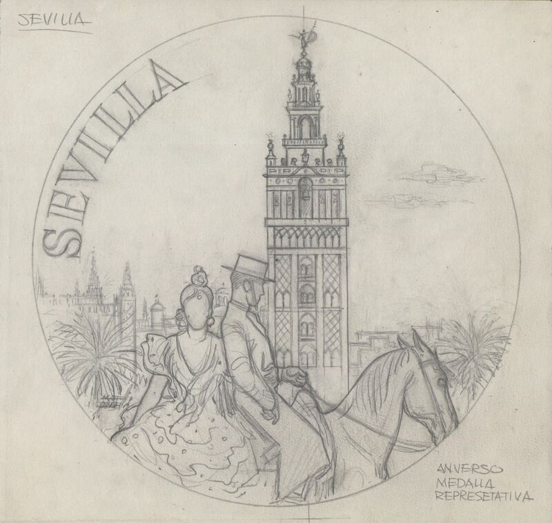 - Boceto a lápiz del anverso de una medalla representativa de la ciudad de Sevilla, donde en primer término se aprecia a una pareja a caballo, la mujer vestida contraje andaluz junto a un hombre vestido de corto y de fondo se observa la Giralda.Realizada para Acuñaciones Españolas. Otros Archivos: MBR/1492