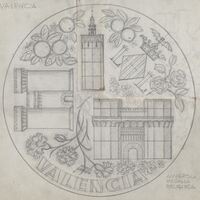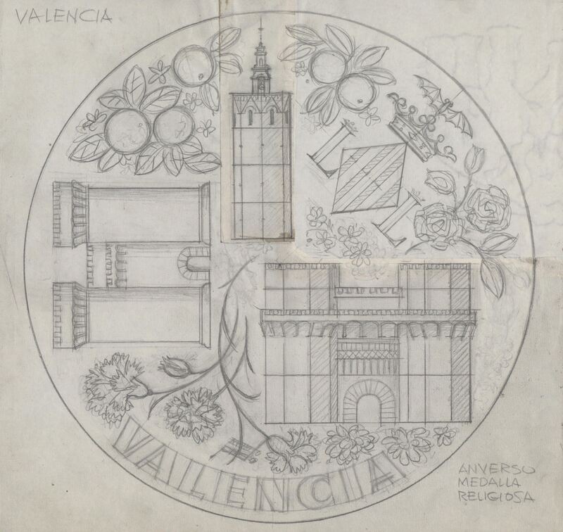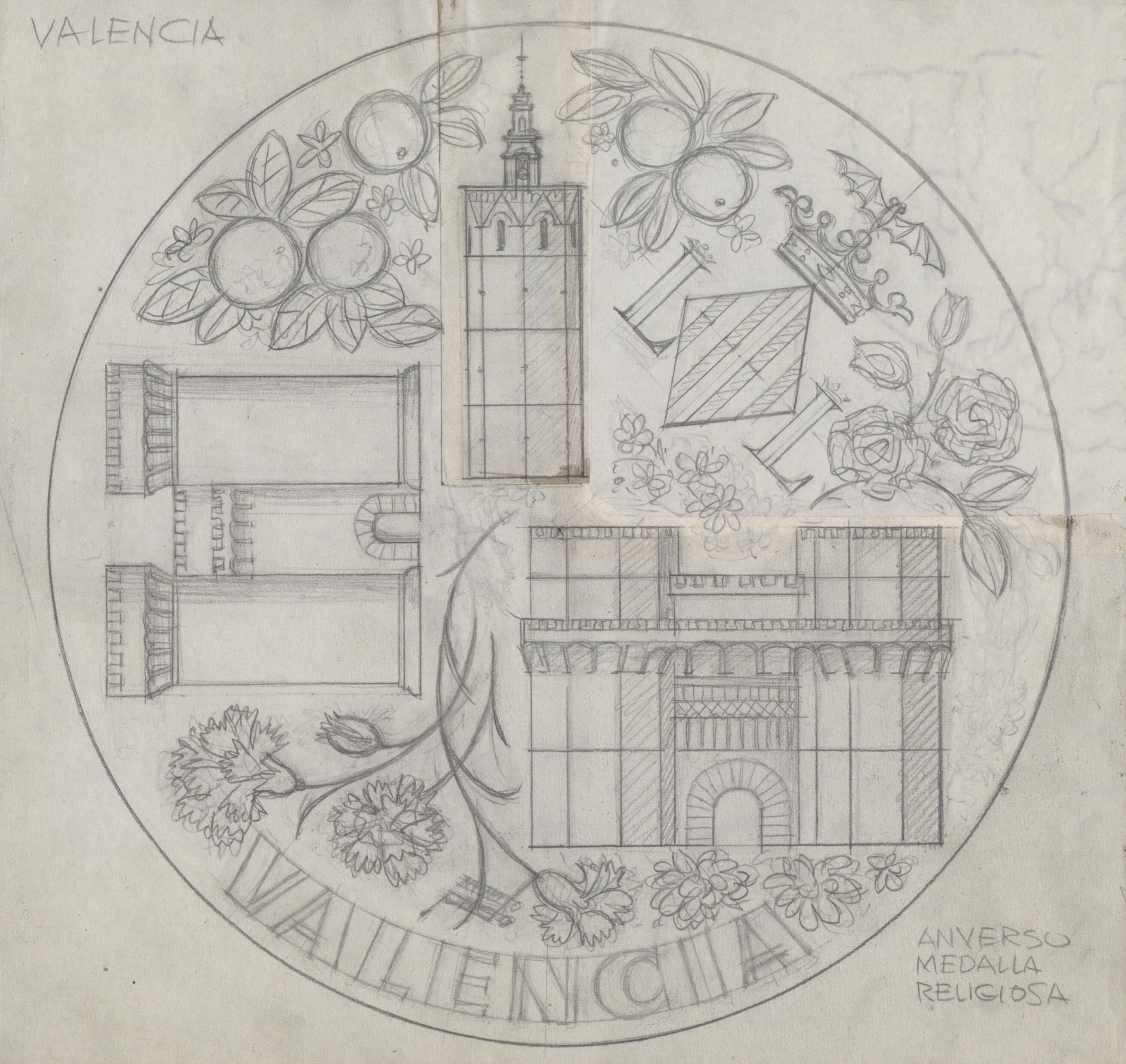- Boceto a lápiz del anverso de una medalla religiosa de Valencia, formada por un conjunto de elementos arquitectónicos de la ciudad junto a motivos decorativos frutales y florales.Para Acuñaciones Españolas. Otros Archivos.: MBR/1459