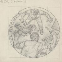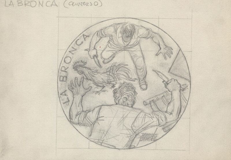 - Boceto a lápiz del anverso de la medalla La Bronca, con la imagen de dos hombre luchando en aptitud de lucha y ataque, donde uno de ellos sostiene un arma blanca junto a la figura de un gallo.Boceto realizado para un a futura medalla titulada"LA BRONCA" anverso. Sin más referencias