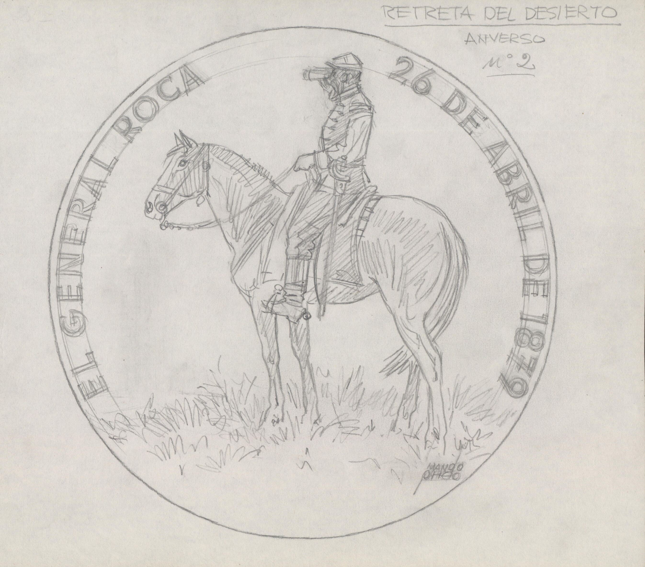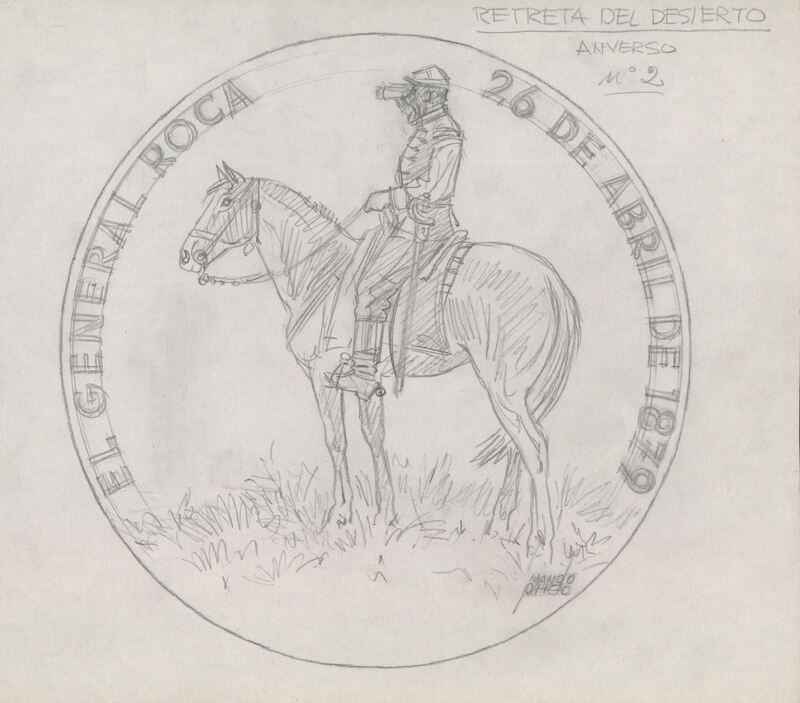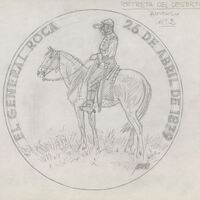 - Boceto a lápiz del anverso de la medalla Retreta del desierto, con la figura de un militar del siglo XIX a caballo junto a las letras inscritas en el perfil “El general roca, 26 de Abril 1879”.Sin referencias