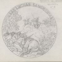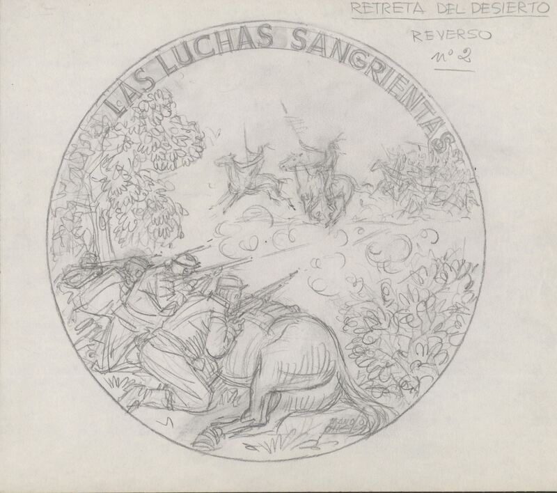 Boceto a lápiz del reverso de la medalla número dos sobre el tema retreta del desierto, con la escena de unos soldados americanos resguardándose sobre el lomo de un caballo abatido, frente a la llegada de un grupo de indios avanzando a caballo, junto a las letras que rodean el perfil donde se lee “Las luchas sangrientas”.Sin referencias