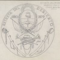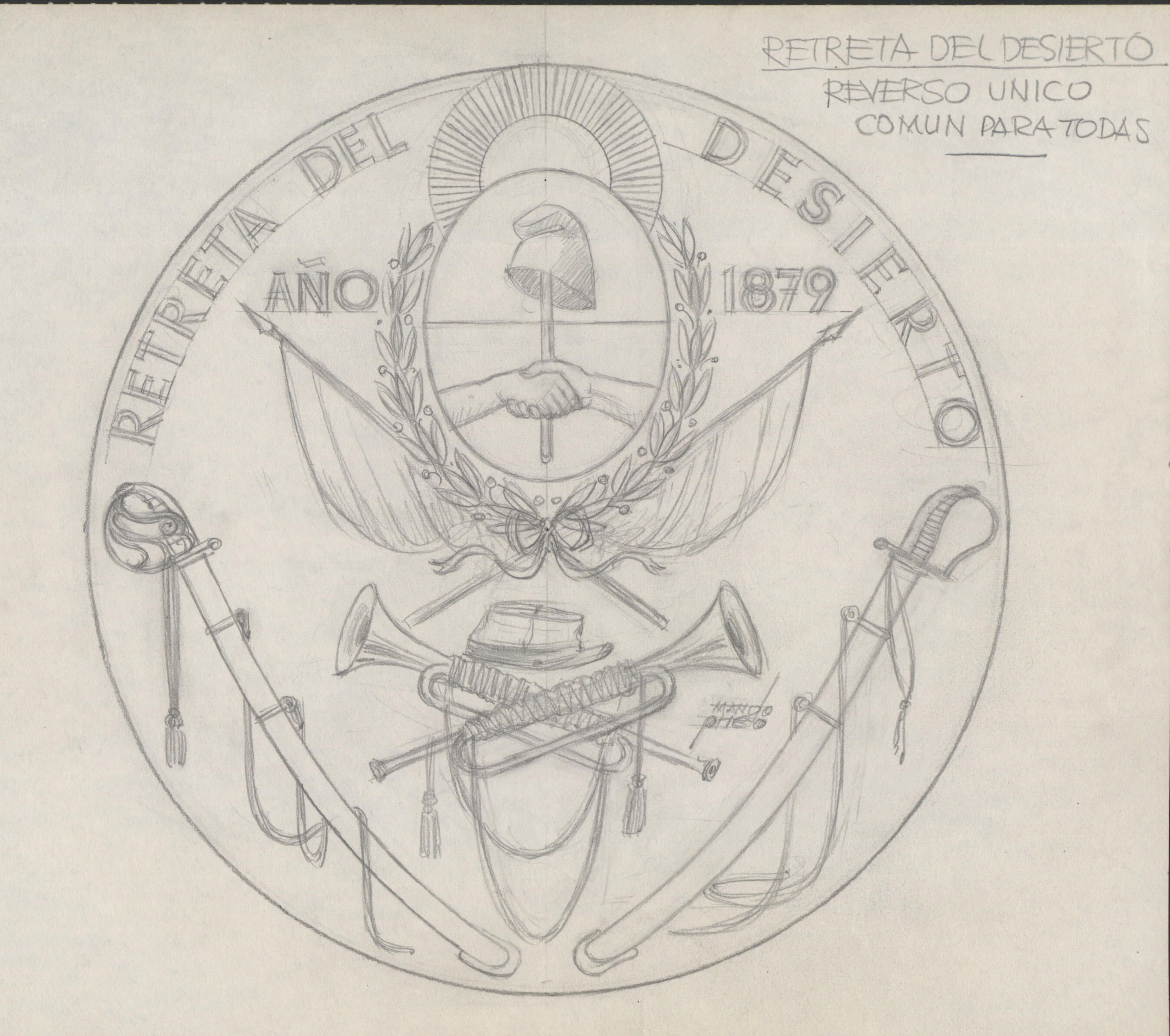 Boceto a lápiz del un único reverso de la medalla retreta del desierto, que representa dos manos unidas con un apretón, como gesto de acuerdo, rodeado por una corona de laurel y diferentes elementos militares que ocupan el campo de la medalla rematado por dos sables, junto a las letras que rodean el perfil donde se lee “Retreta del desierto”.Sin referencias de esta serie. Reverso único, común para todas la serie.