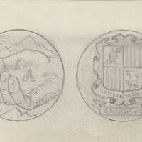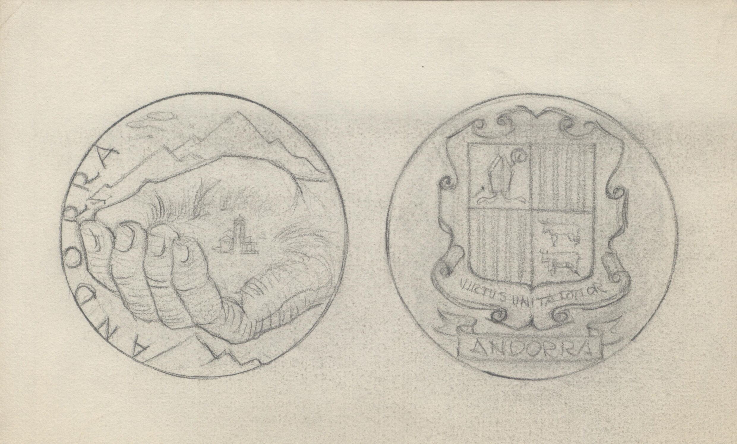 - Boceto a lápiz de las caras de una medalla representativa de Andorra, en una de ellas la imagen de una gran mano que ocupa el campo de la medalla en cuyo fondo se aprecia la silueta de un conjunto montañoso junto al boceto de la otra cara donde se aprecia el escudo de Andorra.Sin referencias