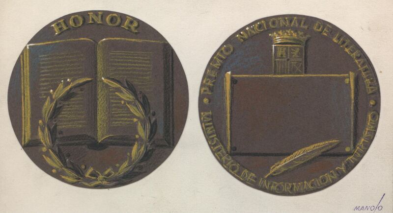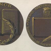- Anverso de una medalla con la imagen de un libro abierto por la mitad junto a una corona de laurel en la parte superior la palabra escrita “Honor”, al lado el reverso con un cuadro que representa quizás una placa conmemorativa con un escudo en la parte superior y en la parte inferior una pluma de escribir.SIN REFERENCIAS
