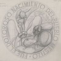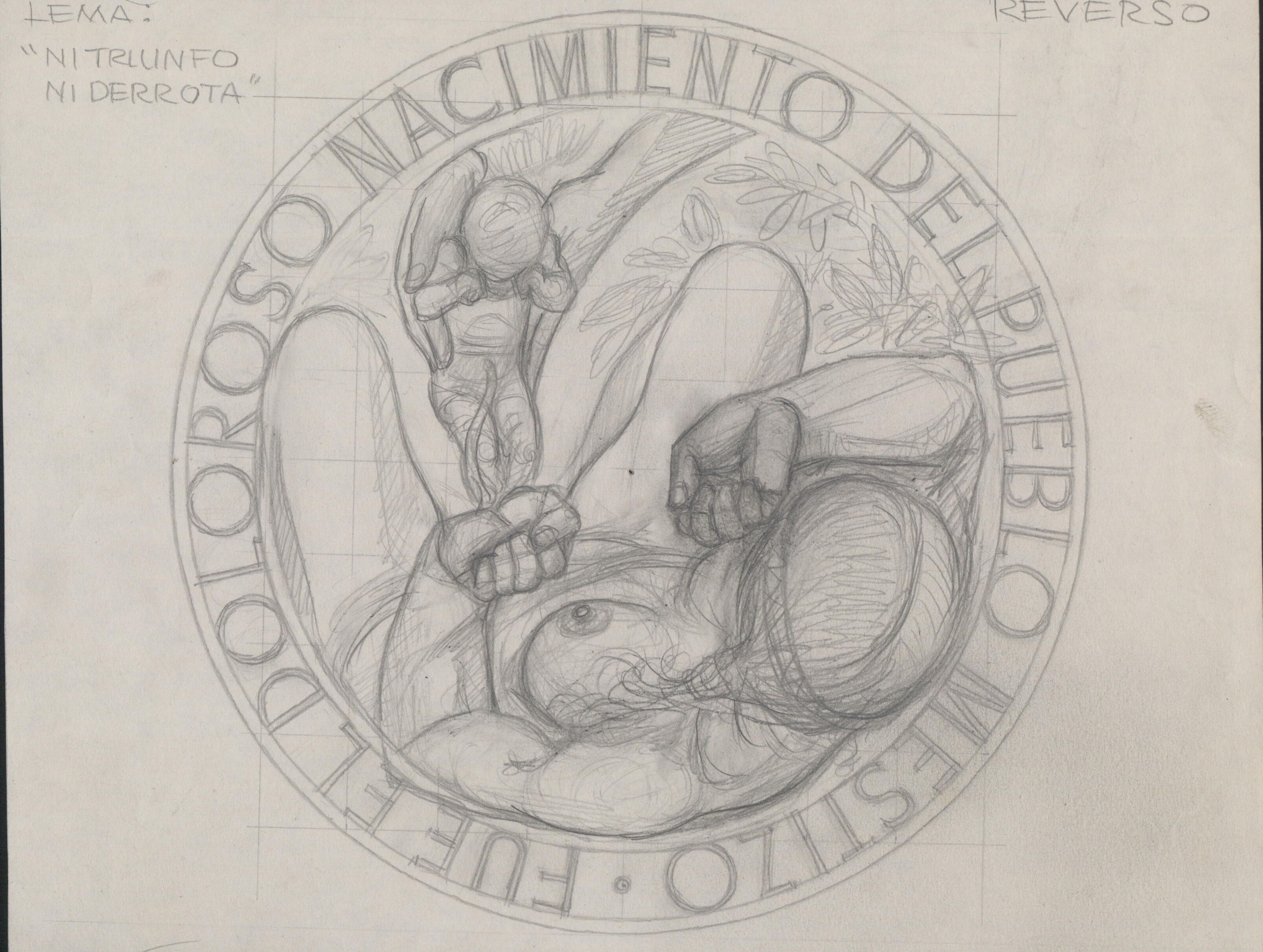 Boceto a lápiz del reverso de la medalla titulada “Ni triunfo ni derrota”, con la imagen de una indígena dando a luz un niño que es cogido por una manos, rodeado por la leyenda en la que se lee “fue el doloroso nacimiento del pueblo mestizo”.Presentada para el concurso de medallas de Isidro Cistaré en Barcelona. Primer Premio!. Otros Archivos: MBR/1475