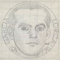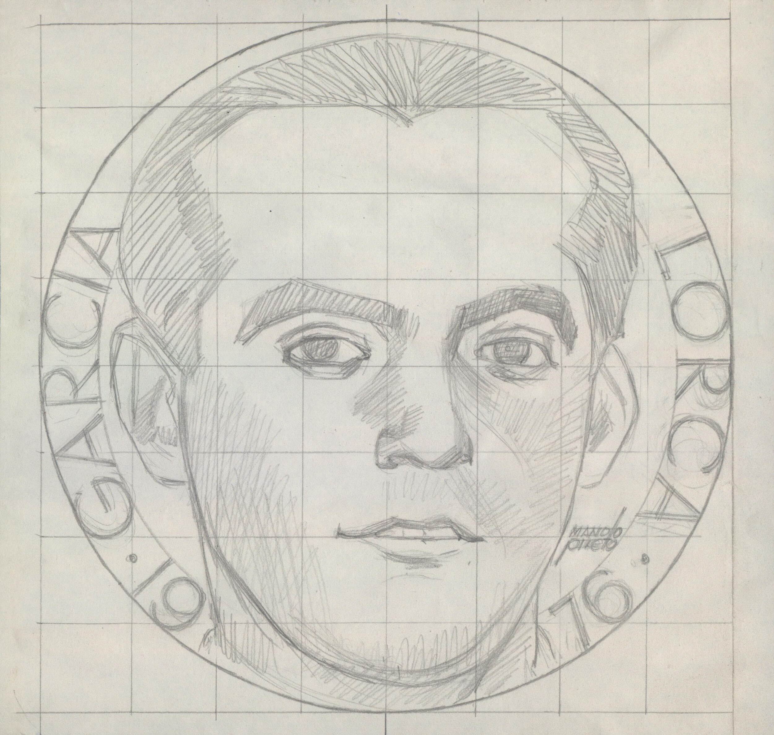 - Boceto a lápiz sobre fondo cuadriculado donde en primer término se aprecia el retrato del poeta granadino Federico García Lorca, rodeado por las letras de su nombre y unas fechas.Sin referencias. Otros Archivos: MEP/1686 MG/1544