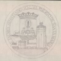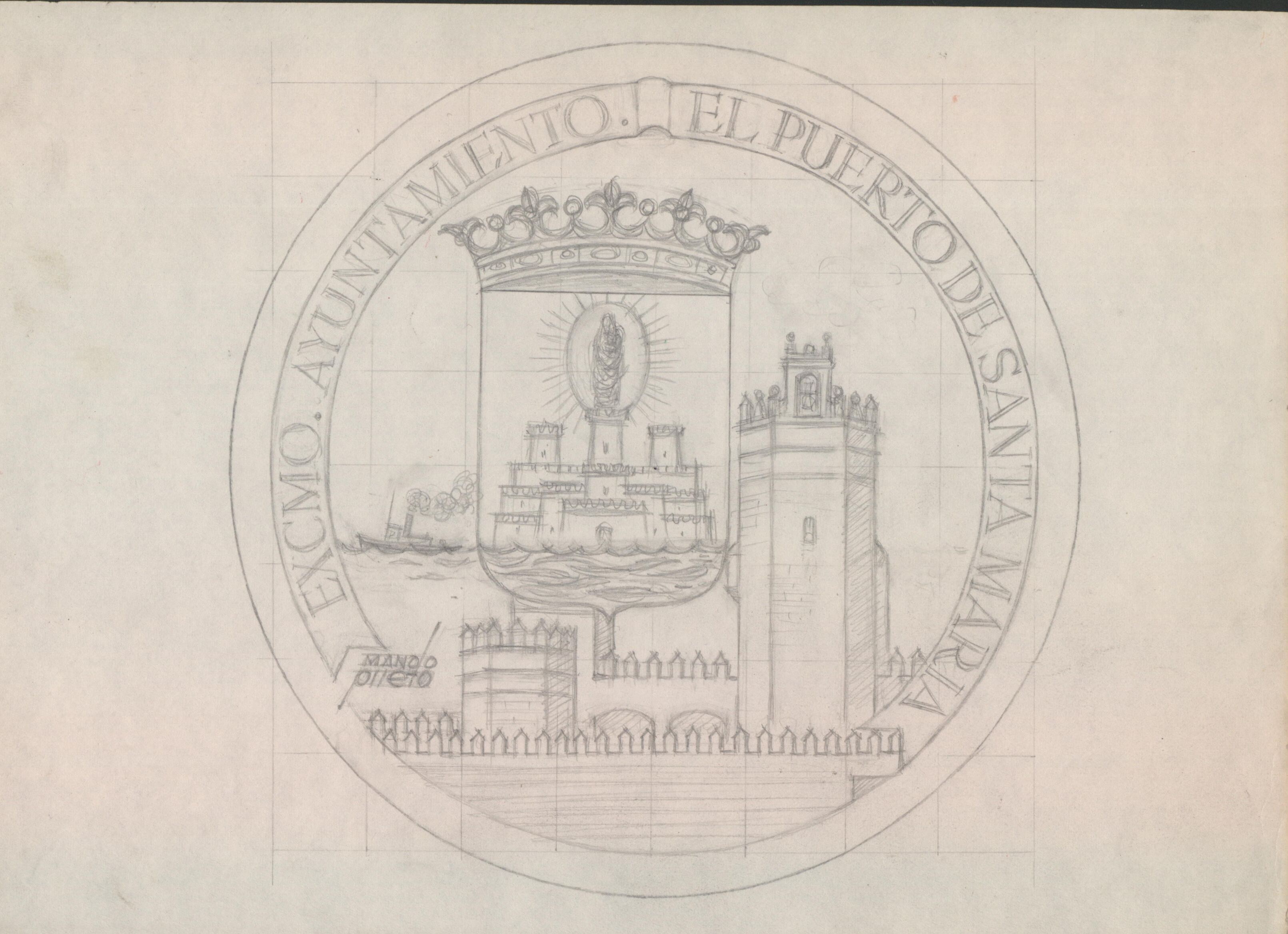 - Boceto a lápiz de una de las caras de una medalla representativa del Puerto de Santa María, con la imagen de edificios arquitectónicos simbólicos de la ciudad, junto al escudo del excelentísimo ayuntamiento del Puerto.Medalla commemorativa de los 100 años de la Plaza de toros de El Puerto de Santa María. Otros Archivos.: MBR/1436