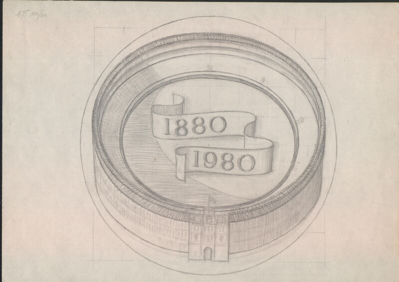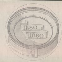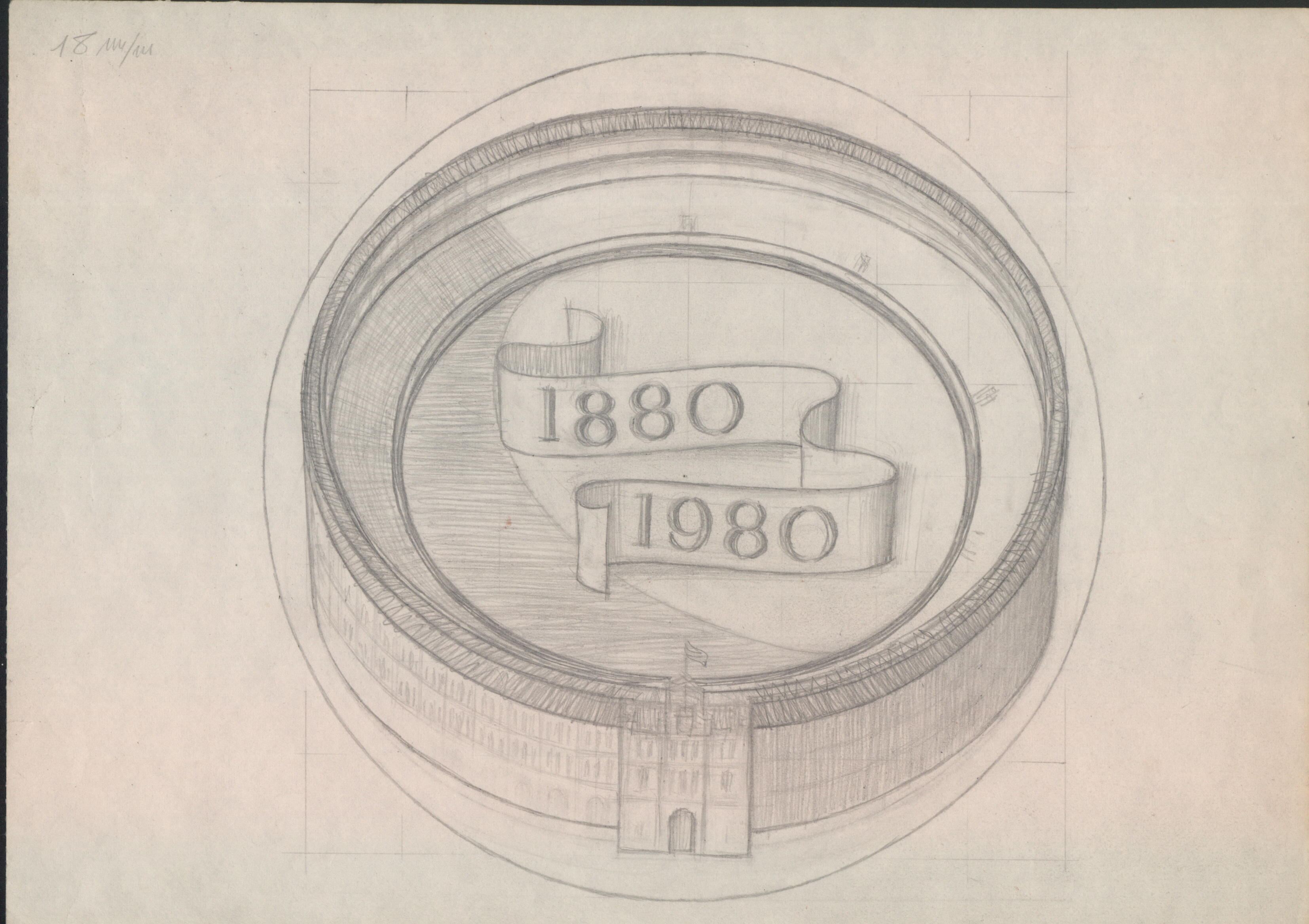 - Boceto a lápiz de la cara de una medalla conmemorativa de la Plaza de Toros del Puerto, donde en el centro del ruedo se aprecia dos fechas en diferentes cartelas que indican los cien años de su existencia.Para el Exmo. Ayto. de El Puerto der Santa María Cadiz. Otros Archivos.: MBR/1436