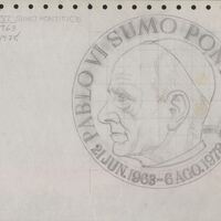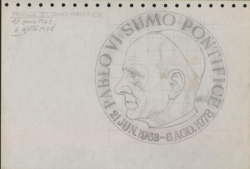 - Boceto a lápiz de una de las caras de una medalla conmemorativa del Papa Pablo VI, con el perfil, mirando hacia la izquierda, del pontífice rodeado por su nombre y los años de pontificado.realizada para el Instituto Numismático. Otros Archivos.: MEN/ 1786