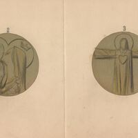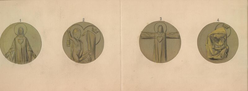 Boceto de cuatro imágenes correspondientes al anverso y reverso de las caras de dos medallas numeradas del uno al cuatro, la primera la figura un Sagrado Corazón junto a la imagen de la Virgen María besando al Niño Jesús, el segundo boceto la figura de un Sagrado Corazón con los brazos abiertos en forma de cruz junto a una Virgen María acurrucando al Niño Jesús.Sin referencias