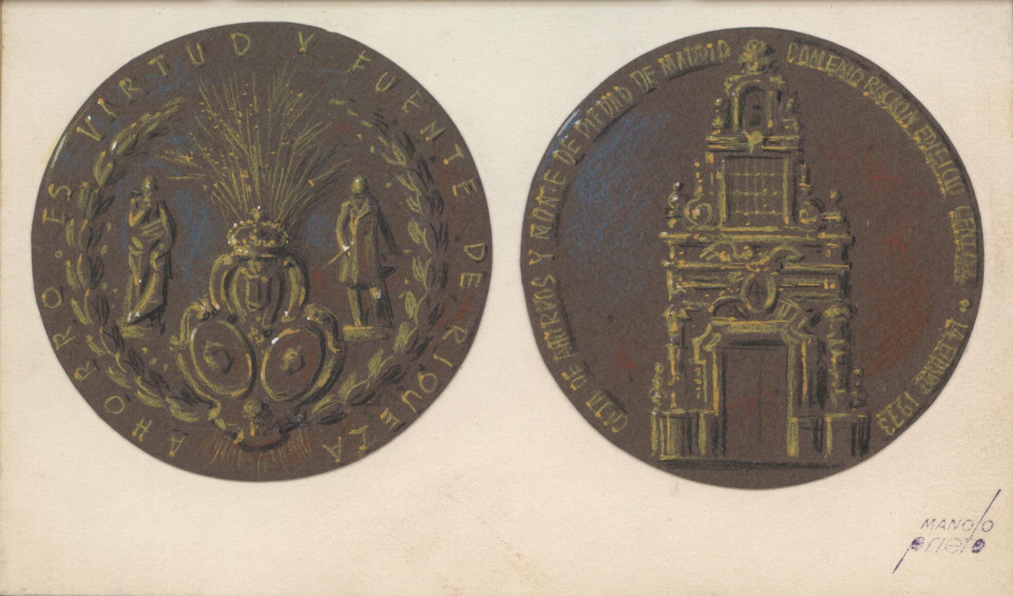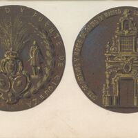 Medalla en donde una de sus caras se puede leer por las letras inscritas en el metal “Ahorro es virtud y fuente de riqueza”con la imagen central de una corona de laurel en cuyo espacio interior aparece un ramo de trigo junto a dos figuras, a su lado la otra cara representa la fachada principal del edificio de la Caja de Ahorros de Monte de Piedad en Madrid.para la C.A.M.P. de Madrid edificio Central Otros Archivos.:MBR/1496 MBO/363