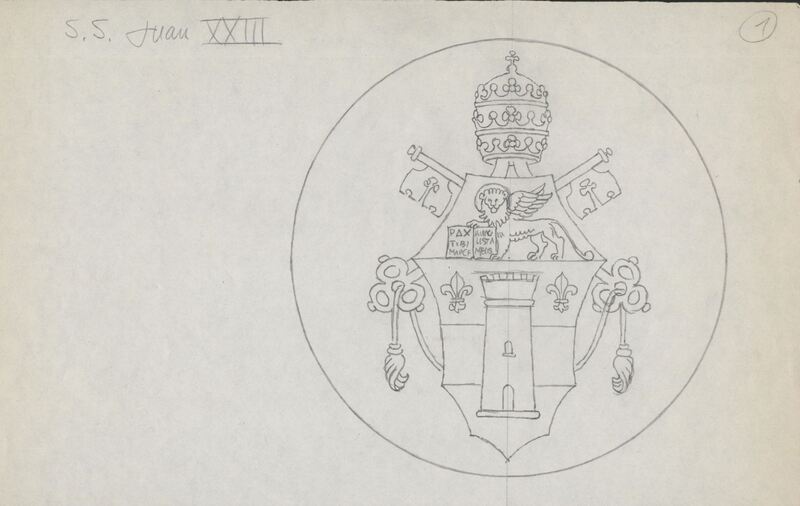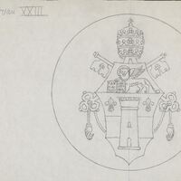 - Boceto a lápiz de un escudo coronado por la tiara papal y las llaves símbolo del reinado terrenal de la Iglesia en el mundo como representación y salvaguarda de la doctrina y enseñanzas de Jesús.Para la Casa de la Moneda, no se realizo este reverso