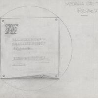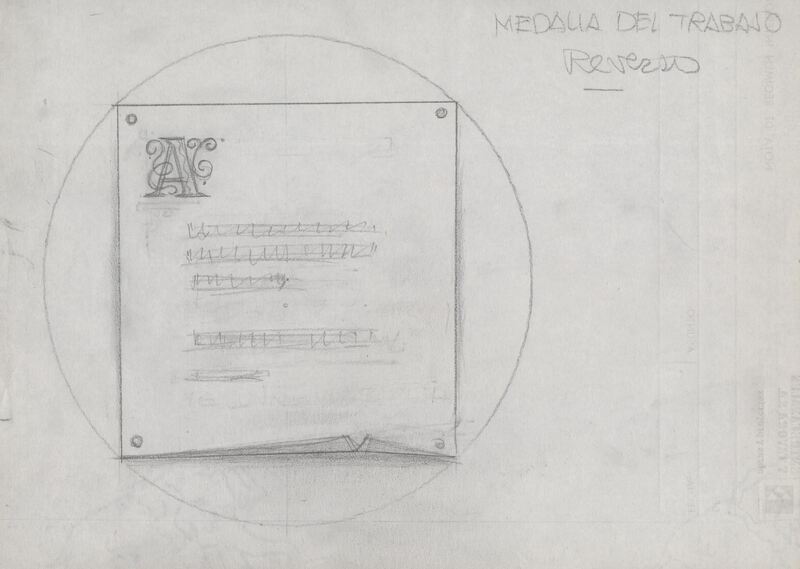 - Boceto a lápiz del reverso de la medalla conmemorativa al trabajo con la imagen de una hoja inscrita en un círculo, cuyas anotaciones están tachadas y en una de sus esquinas superiores la letra mayúscula A.Numismática Iberica
