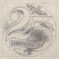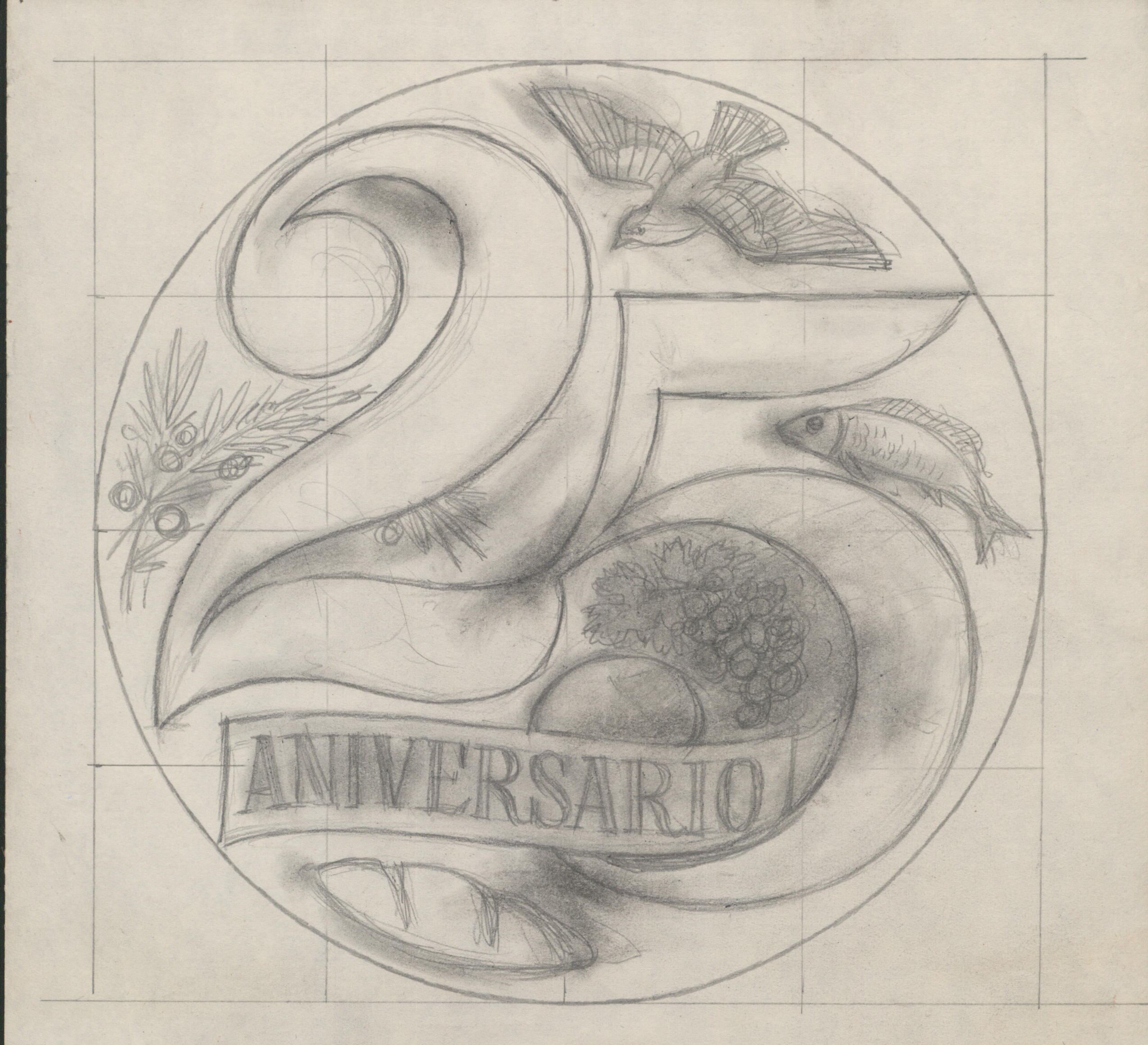 Boceto a lápiz de una de las caras de una medalla conmemorativa del veinticinco aniversario, con la imagen de las números en grande donde debajo se aprecia una cartela con las letras aniversario y decoraciones vegetales y animales a su alrededor.Para numismatica Iberica. No nos entrego ninguna medalla que es el compromiso que tenía con Manolo Prieto
