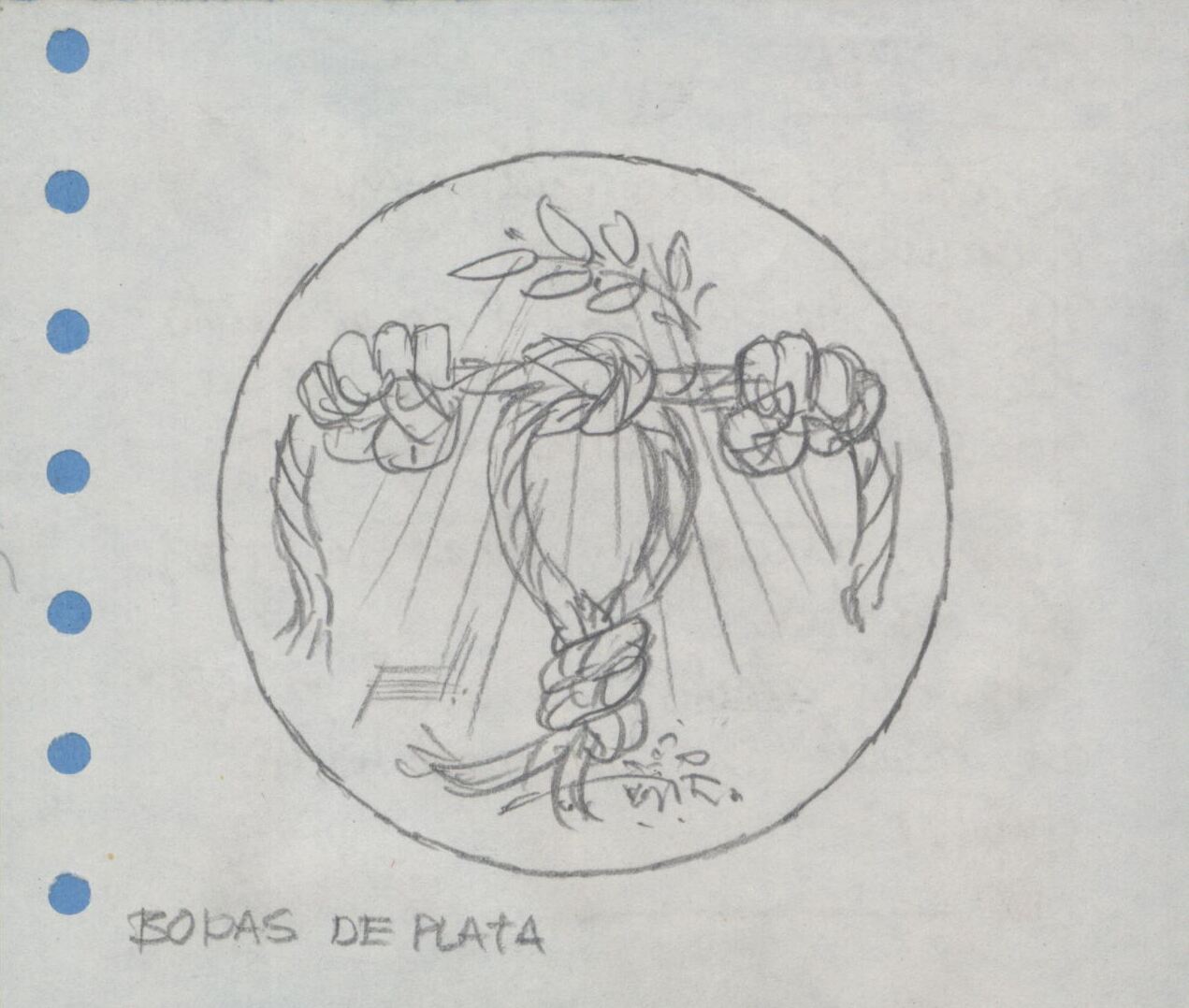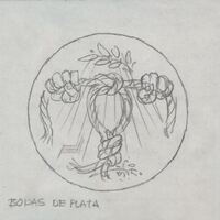 - Boceto a lápiz de una de las caras de una medalla conmemorativa de unas bodas de plata, con la imagen de dos manos atando una cuerda con un segundo nudo junto a unas ramas de laurel.Notenemos referencia, probablemente seria otro estudio paraNumismática Iberica