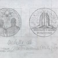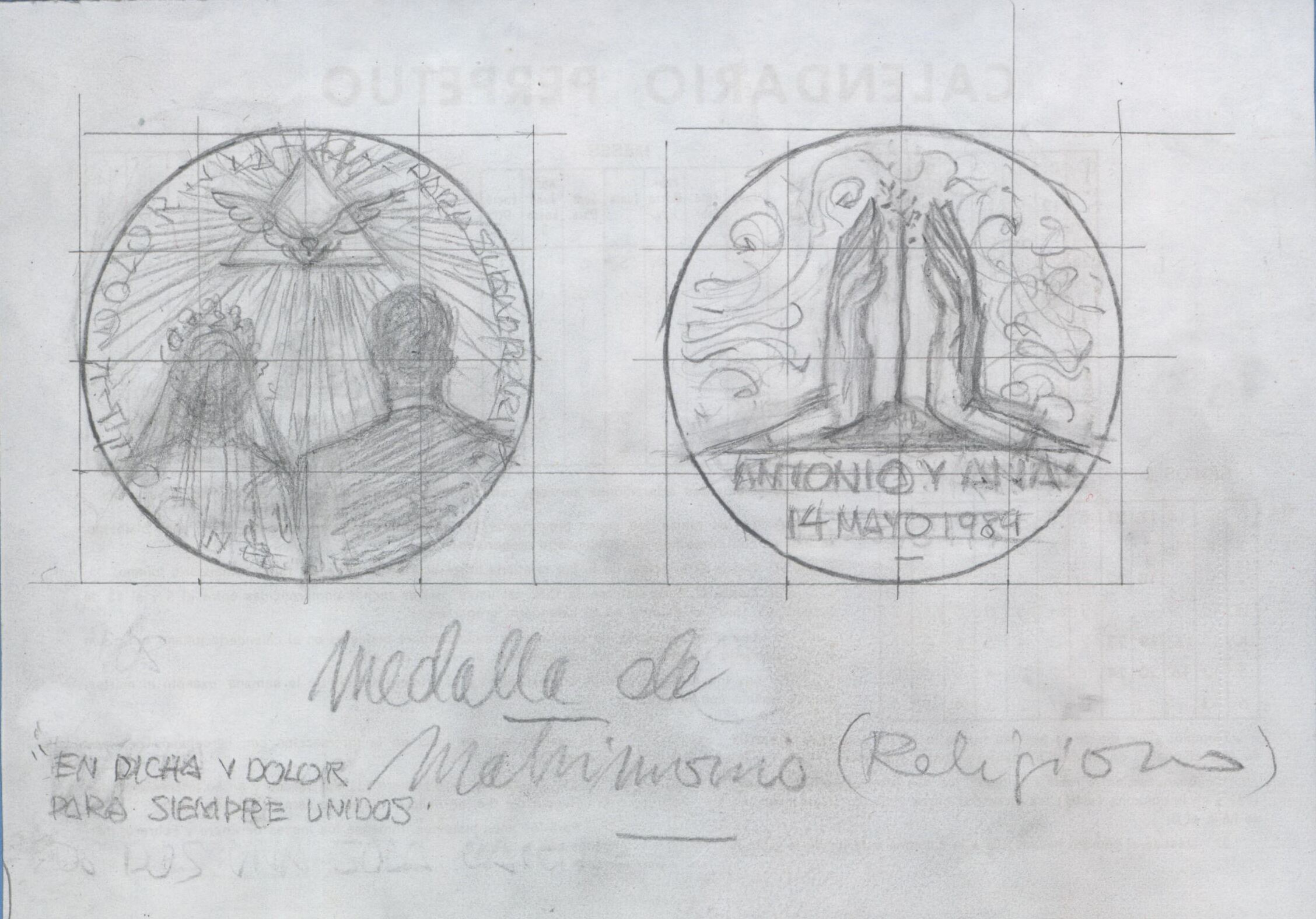 Boceto a lápiz sobre fondo cuadriculado, de una medalla que representa el matrimonio religioso, en el anverso la imagen de los novios de espaldas en día de su boda frente a Dios y a su lado en el reverso la imagen de dos manos que protegen y conservan un árbol en pleno desarrollo.para Numismáticas Iberica. Otros Archivos.: sin referencias solo en catálogo