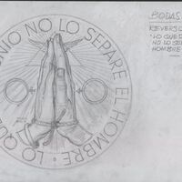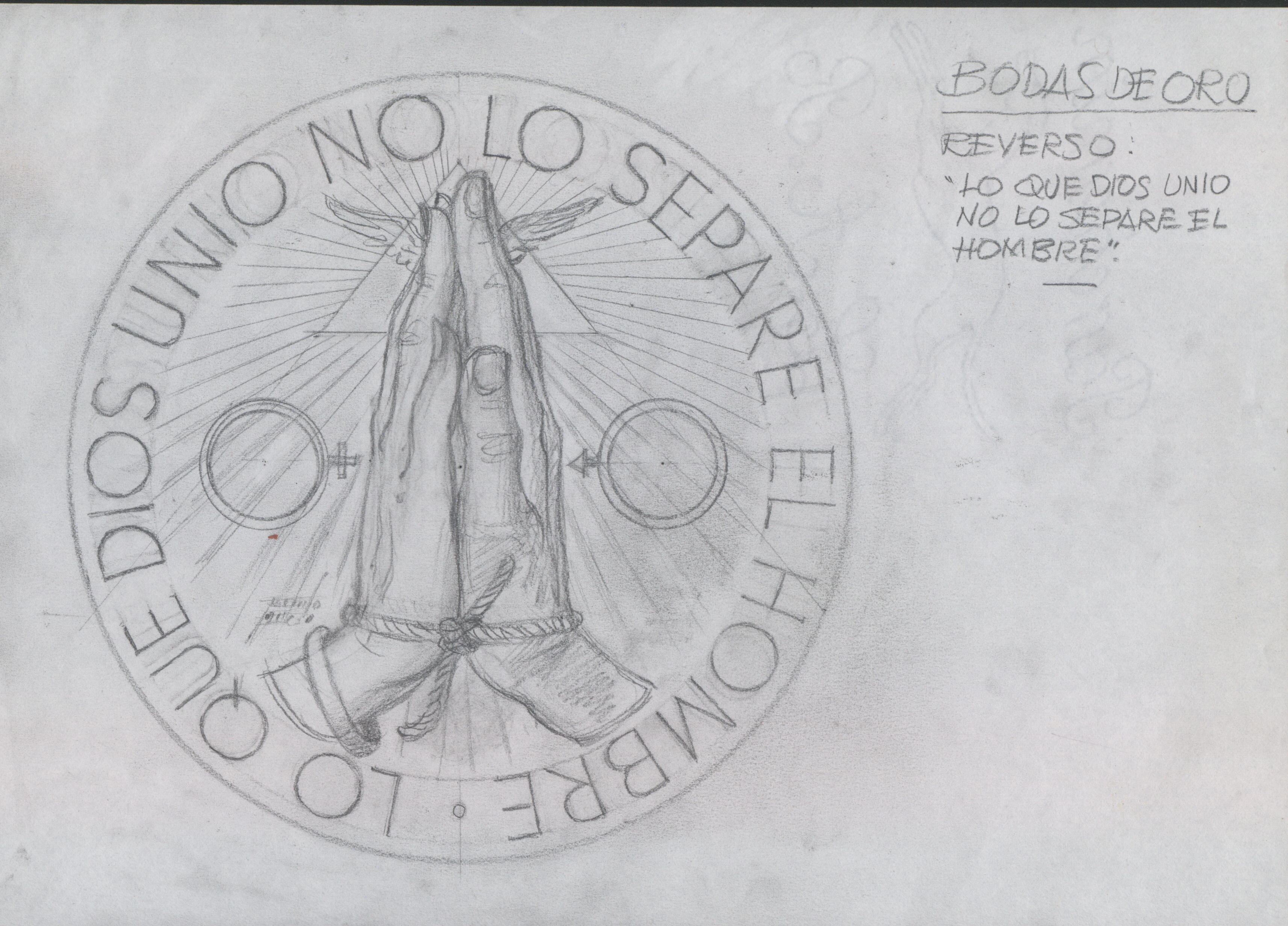 - Boceto a lápiz de una medalla conmemorativa de las Bodas de Oro de un matrimonio, junto a la leyenda inscrita en el perfil que dice que lo que Dios ha unido no lo separe el hombre, con la imagen central de dos manos unidas junto a los símbolos de Dios, hombre y mujer.Para Numismatica Iberica