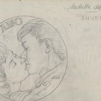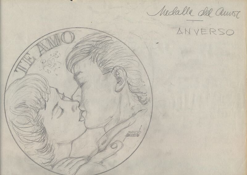 - Boceto a lápiz del anverso de la medalla del amor, que representa los perfiles de un hombre y una mujer, con un look un tanto años 70, besándose junto a las letras “Te amo.”Para Numismatica Iberica