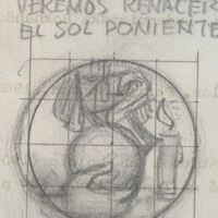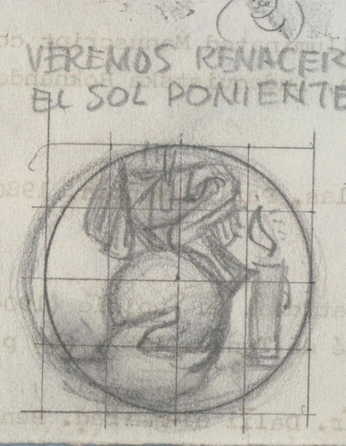 - Primer boceto al lápiz sobre fondo cuadriculado de las caras de una medalla titulada “veremos renacer el sol naciente”, donde se aprecia la figura de una mano sujetando una esfera junto a una vela.para Numismatica Iberica. Otros Archivos.:MBO/431 + 395 MBR/1366