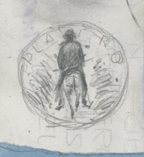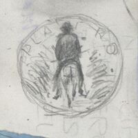 - Primer boceto a lápiz de la cara de una medalla, donde se representa la figura de un hombre con sombrero sobre un caballo, junto a unas letras en la zona superior de la medalla.bosquejo de medalla sobre "Platero". Sin referencias. Otros archivos relacionados: MBO/683-686