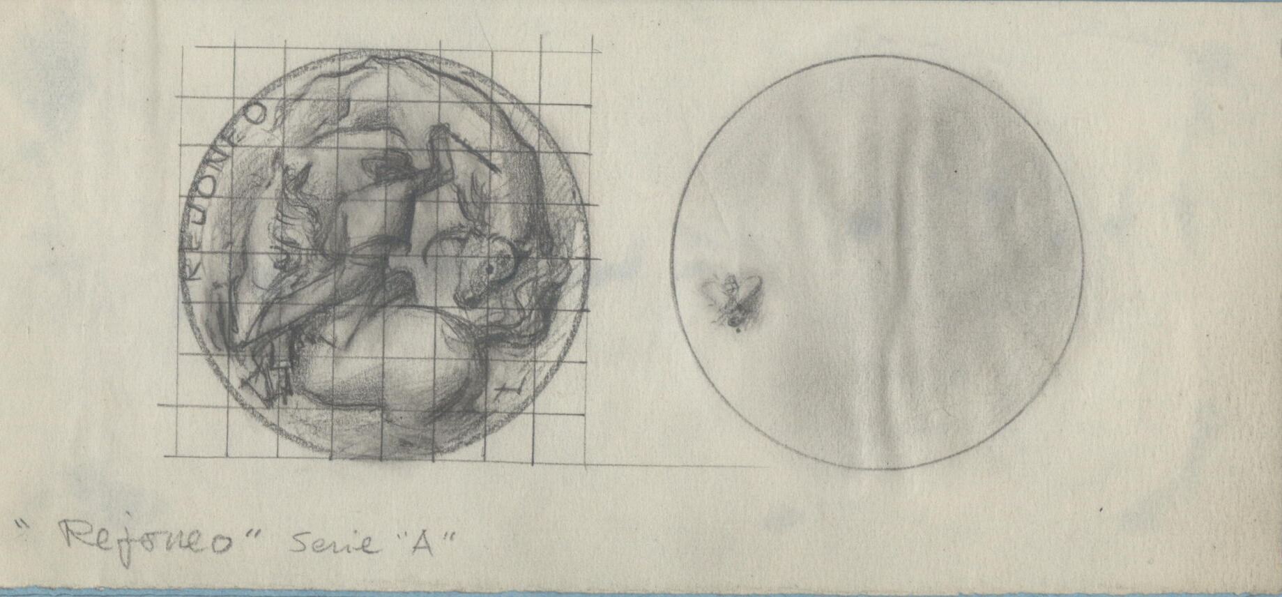 - Boceto a lápiz sobre fondo cuadriculado de una de las caras de una medalla titulada Rejoneo, donde se aprecia la figura de un hombre vestido de corto sobre un caballo, alzando uno de sus brazos donde lleva las banderillas que clavará al toro.Por encarco de la Casa de la Moneda para la serie Tauromaquia. Otros archivos relacionados: MB/.1393