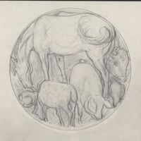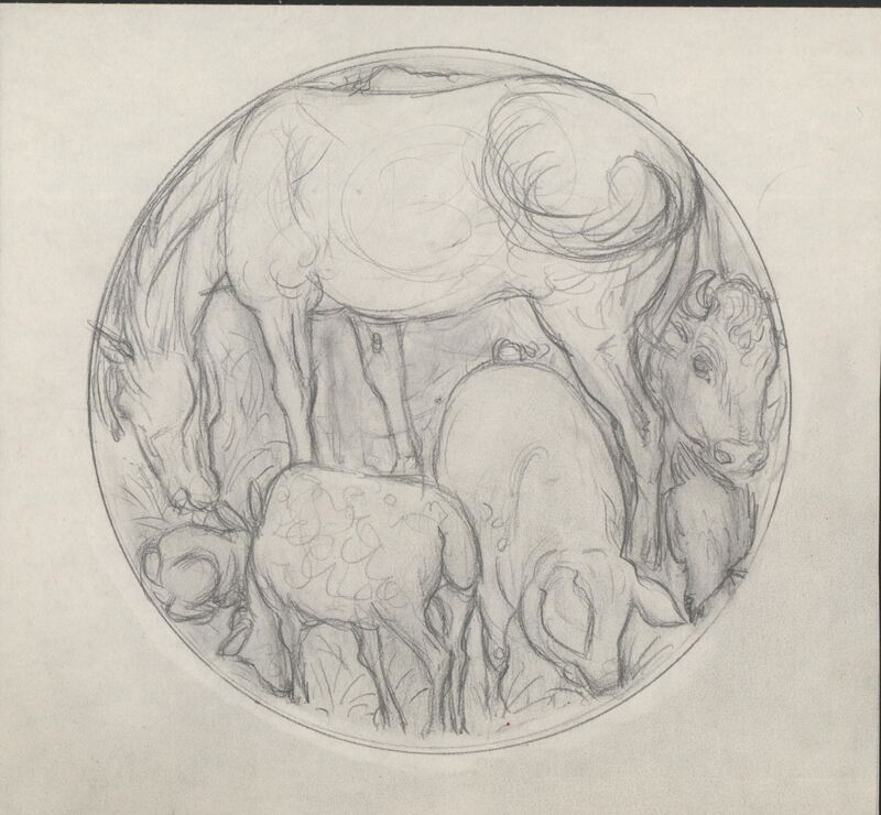- Boceto a lápiz de la cara de una medalla, donde se representa a un conjunto de animales, a un caballo de espaldas de uno de sus lados sobresale la cabeza de una vaca, junto a un cerdo y una oveja.Realizada para Bioter Biona, anverso delamedalla. Otrosarchivos relacionados: MBO/571 MBR/1495
