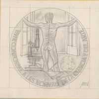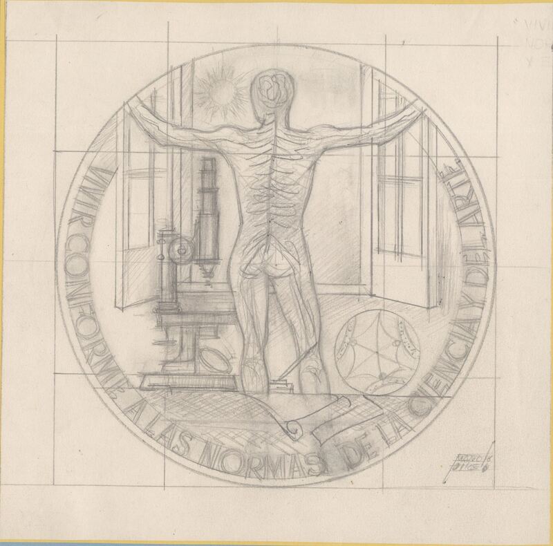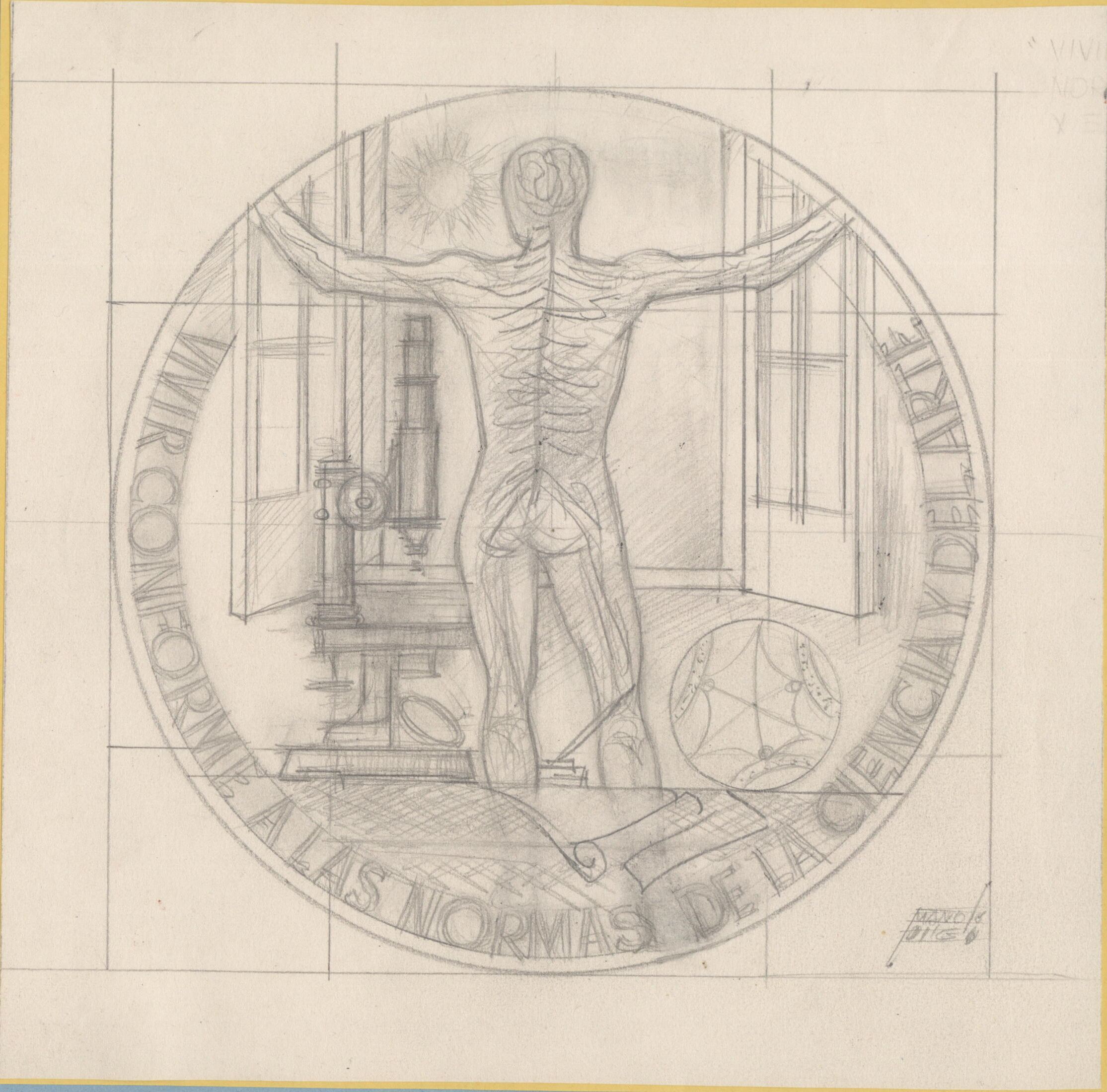- Boceto a lápiz sobre fondo cuadriculado de la cara de una medalla, con la imagen de un hombre de espaldas apoyándose en las contrapuertas de una ventana con los brazos en cruz y el cuerpo dejando ver la anatomía interna, junto a un microscopio y demás elementos de estudio.Proyecto de una medalla, Sin referenmcias.