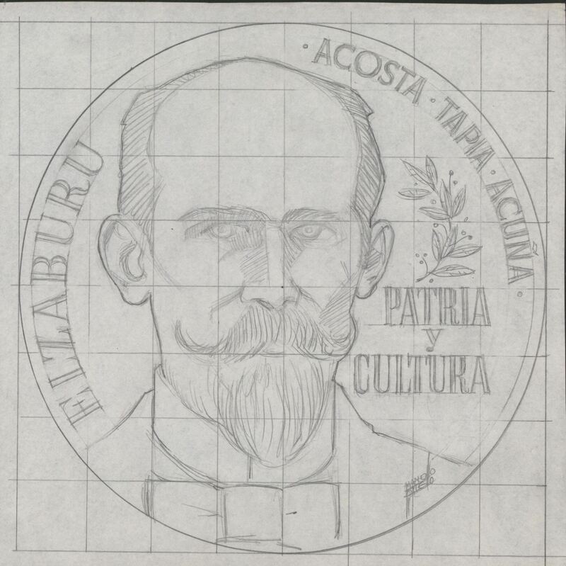 - Boceto a lápiz sobre fondo cuadriculado de una de las caras de una medalla titulada Patria y Cultura, con el retrato un poco esquematizado de Elzaburu Acosta Tapia Acuña.Anverso proyecto de medalla. Sin Referen cias