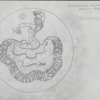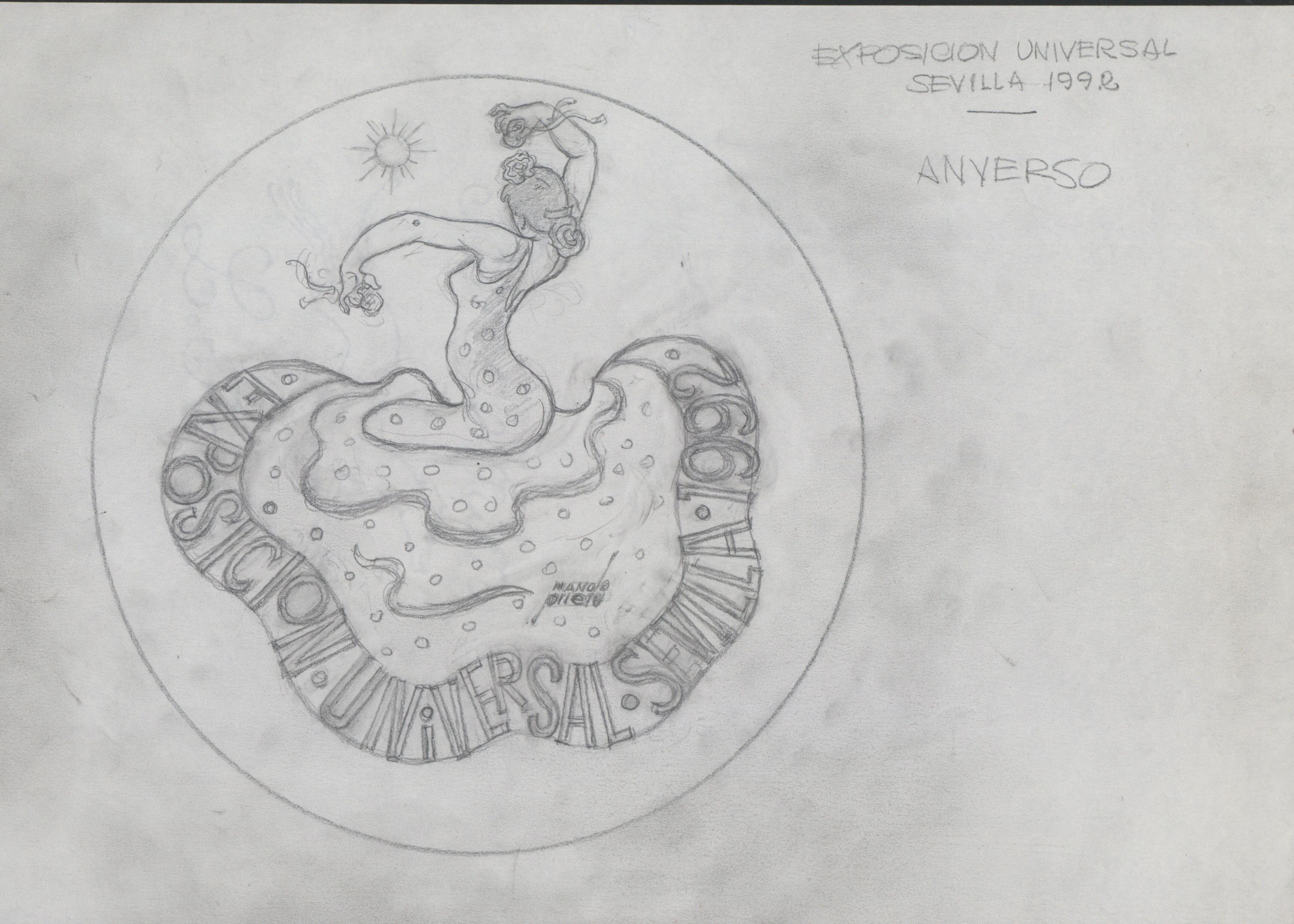 Boceto a lápiz del anverso de la medalla conmemorativa de la Exposición Universal del año 1992 en Sevilla, con la imagen de una mujer bailando vestida con el traje típico Andaluz ribeteado todo el bordillo de la falda con las letras de la exposición universal.Paara Numismatica Iberica boceto del anverso. NO NOS FACILITO LA REPRODUCCIÓN DE LA MEDALLA EN METAL.