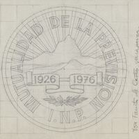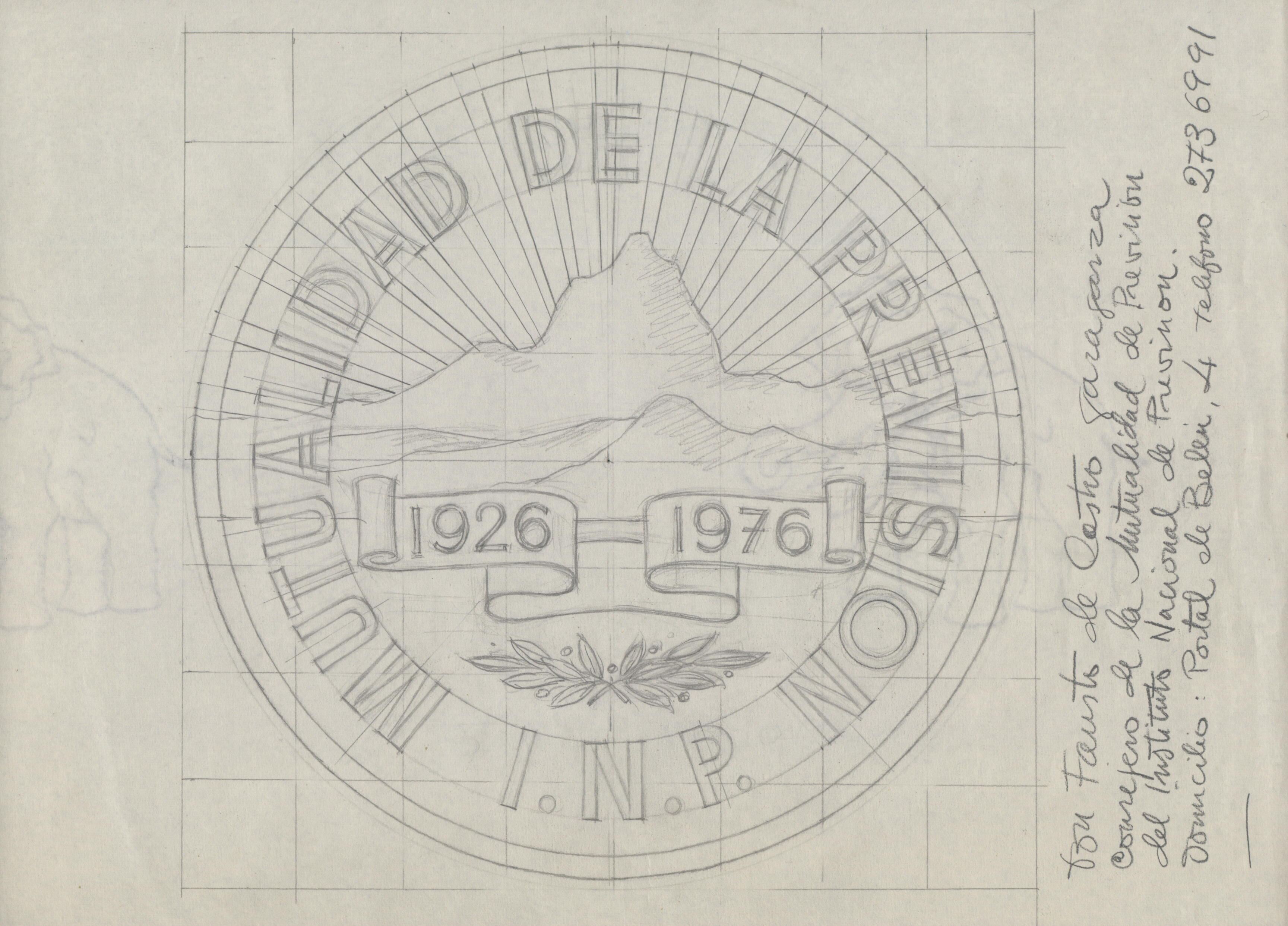 Boceto a lápiz de una de las caras de una medalla conmemorativa de del centenario de la Mutualidad de la Previsión, rodeando todo el perfil las letras que dan nombre a la medalla, en cuyo centro se aprecia dos cartelas con las fechas correspondientes al centenario, con un fondo de nubes de donde salen paralelamente los rayos del sol, en un lateral del dibujo anotaciones a lápiz del autor.Medalla para el I.N.P. Mutualidad de Prevision encargo de Faustino Castro. Boceto del reverso. Potros archivos relacionados: MBR/1470