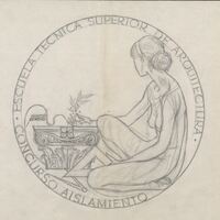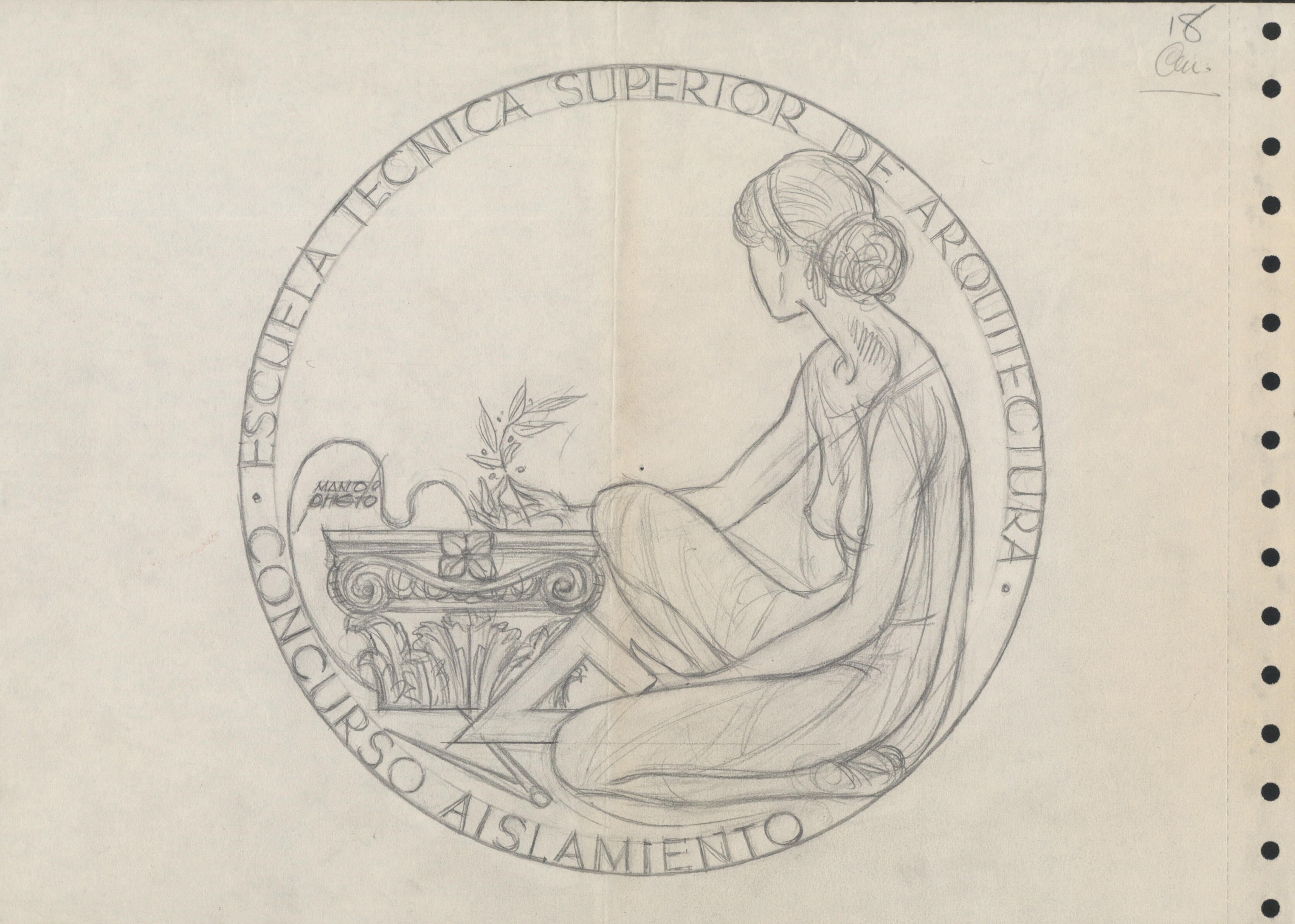 Boceto a lápiz de una de las caras de la medalla de la Escuela Técnica Superior de Arquitectura, con la imagen en primer término de una mujer de perfil sentada cubierta por una tela semitransparentes que deja ver su cuerpo desnudo, apoyando una de sus manos en un capitel que sujeta una rama junto a una escuadra y un compás todo ello rodeado por la leyenda de la medalla.Para Cristalería Española, SA, boceto anverso de la medalla. Otros Archivos.: MBO/579 MBR/1476.