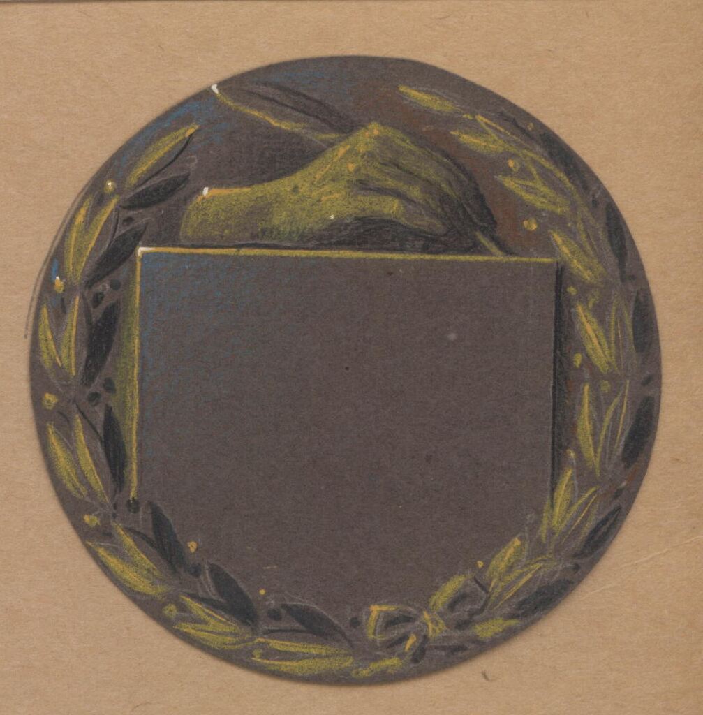 Dibujo de una medalla cuyo perfil está cubierto por una corona de laurel y dentro la imagen de una mano que sujeta una pluma mientras escribe en una hoja. La imagen plana estaría destinada a una posible inscripción.Para laCasa de la Moneda, reverso de la medalla. Otros archivos: MBR/1464