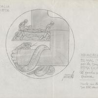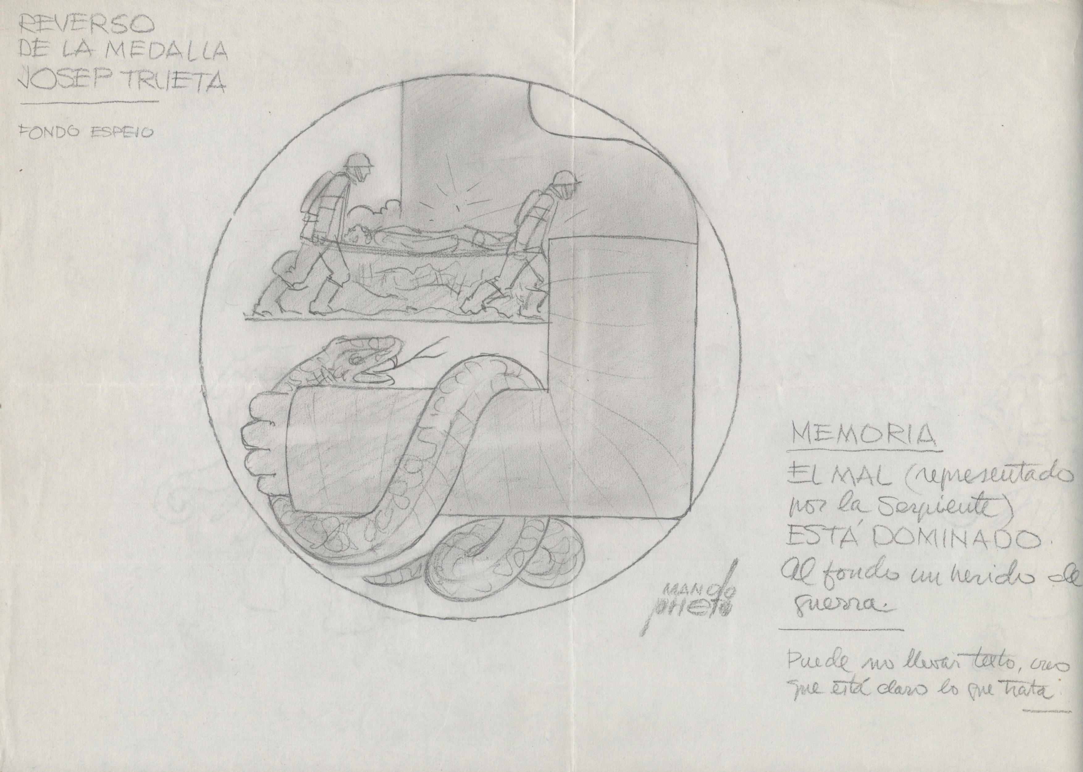 Boceto a lápiz del dibujo de otro reverso de la medalla a Joseph Trueta, con la misma imagen que el boceto número cincuenta y notaciones del autor explicativas de la memoria que comenta la iconografía donde la serpiente representa al mal que está dominado.Para Instituto Numismático, proyecto de reverso. Otros archivos relacionados: MBO/582.