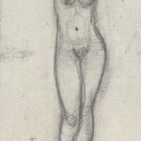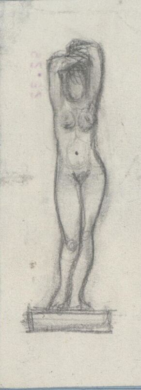 - Primer boceto de trazos rápidos, de un desnudo de mujer de frente sobre un podio que apoya sus brazos en la cabeza con aptitud de pose ante el pintor que la retrata. Parece, incluso, el dibujo de una escultura.Boceto de escultura realizada para el