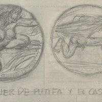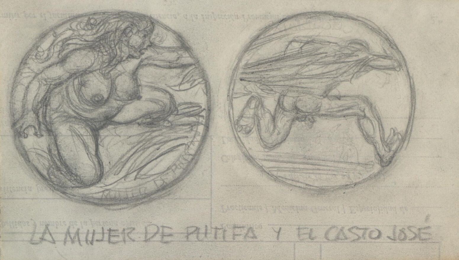 Boceto a lápiz de las caras de una medalla donde el anverso se aprecia el dibujo de una mujer desnuda que sujeta desesperada la túnica de José que huye despavorido ante la tentación imagen representada en el reverso de la medalla.Para el, realizo una serie denominada "Serie erotica."boceto de futura medalla "La mujer de Putifa y el Casto José