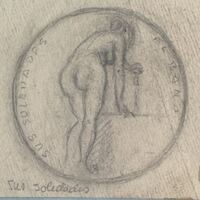 - Boceto a lápiz de una de las caras de una medalla titulada Sus Soledades, con el tema del Baño, representado por la imagen de una mujer desnuda de espaldas abriendo un grifo de una bañera en cuyo borde se apoya.Boceto parauna futura serie "Sus soledades". Sin referencias